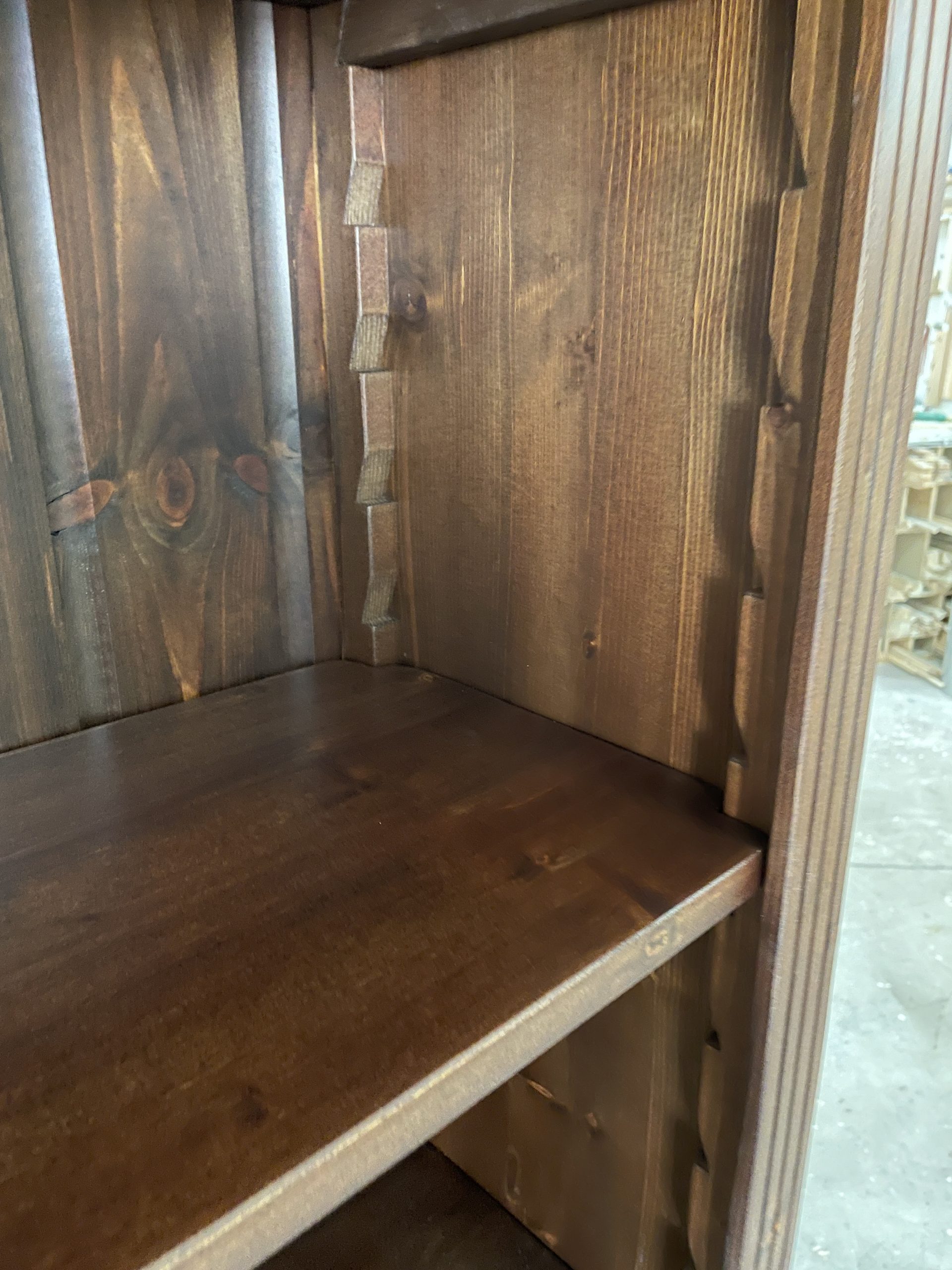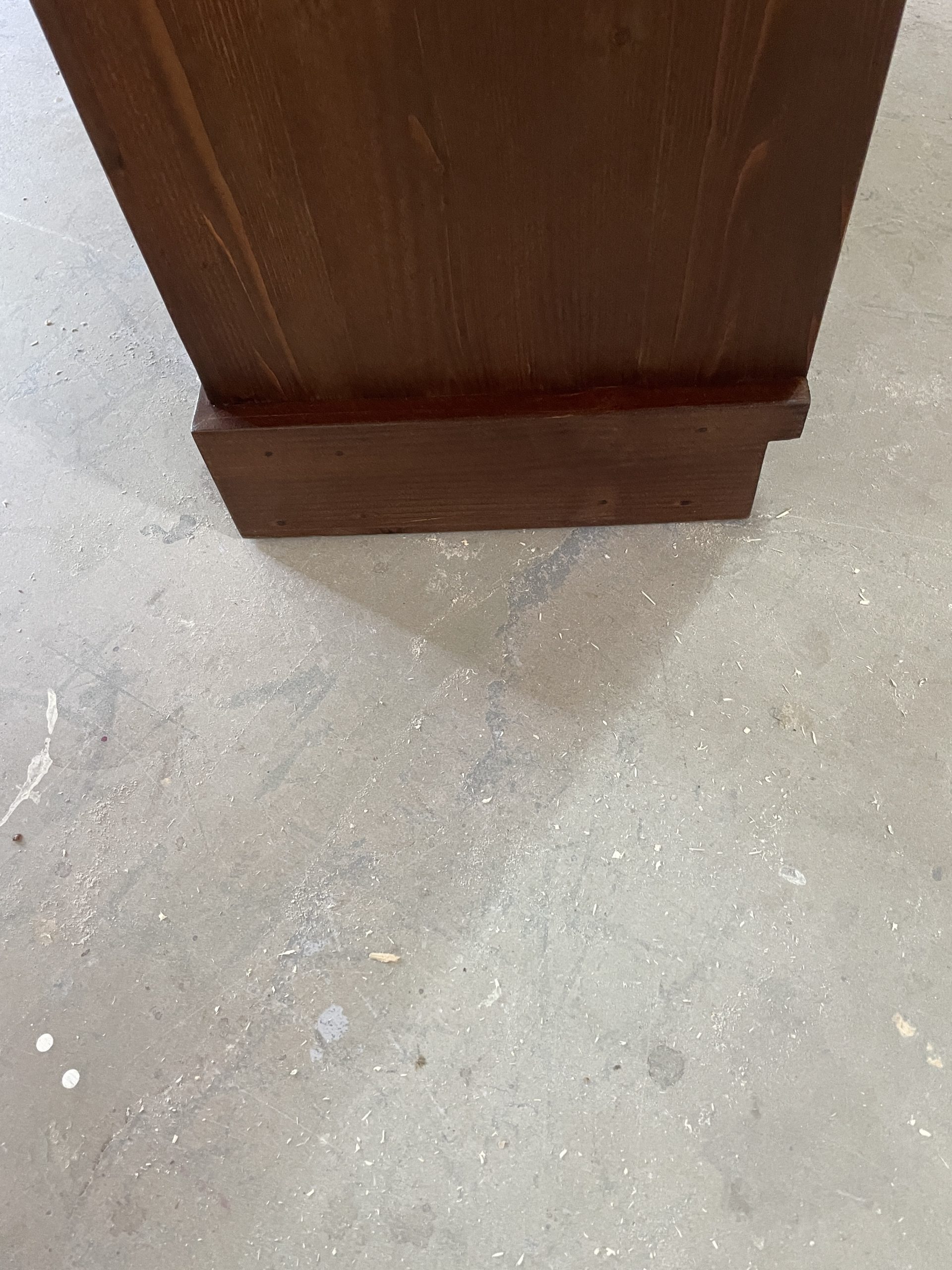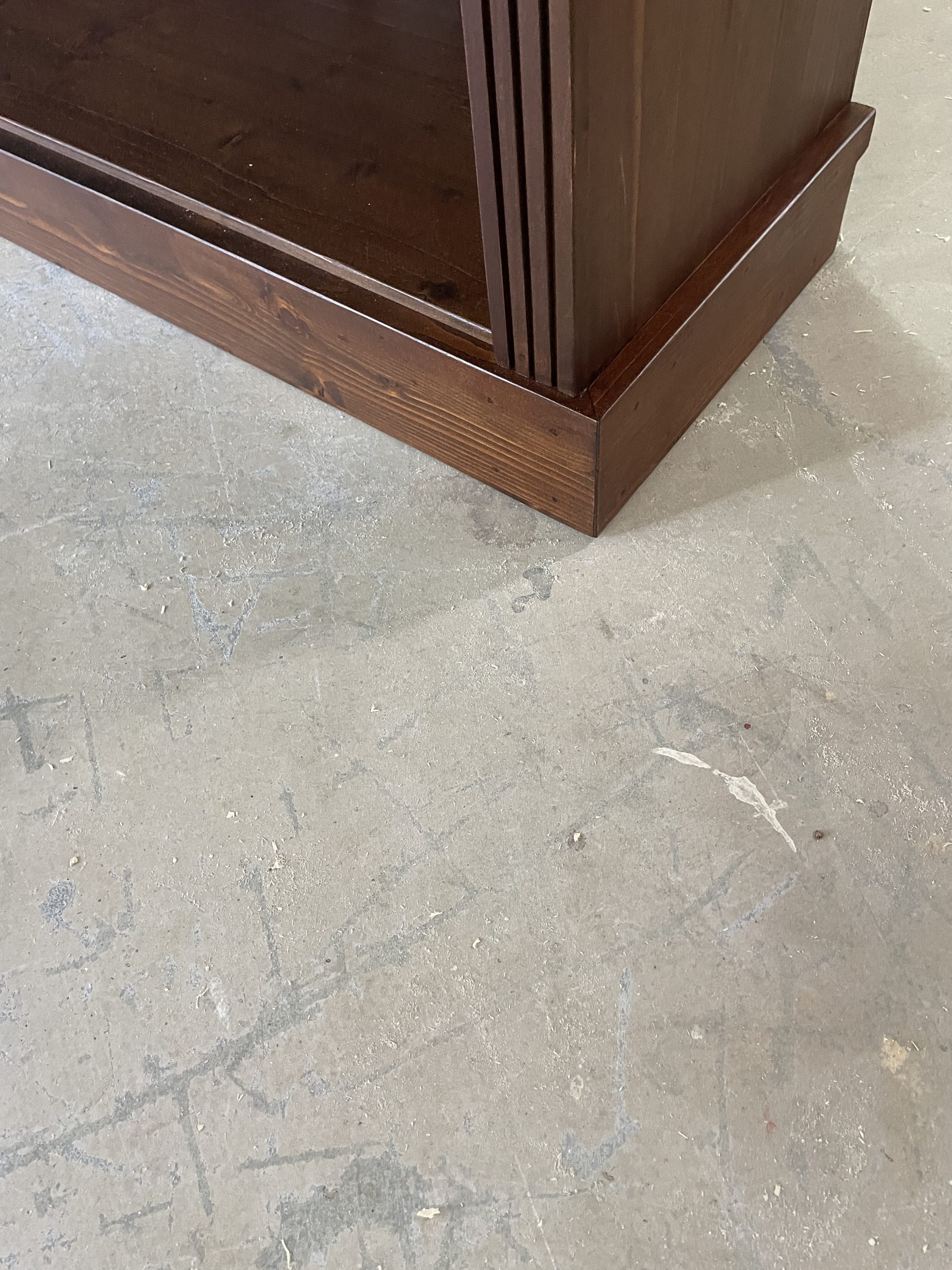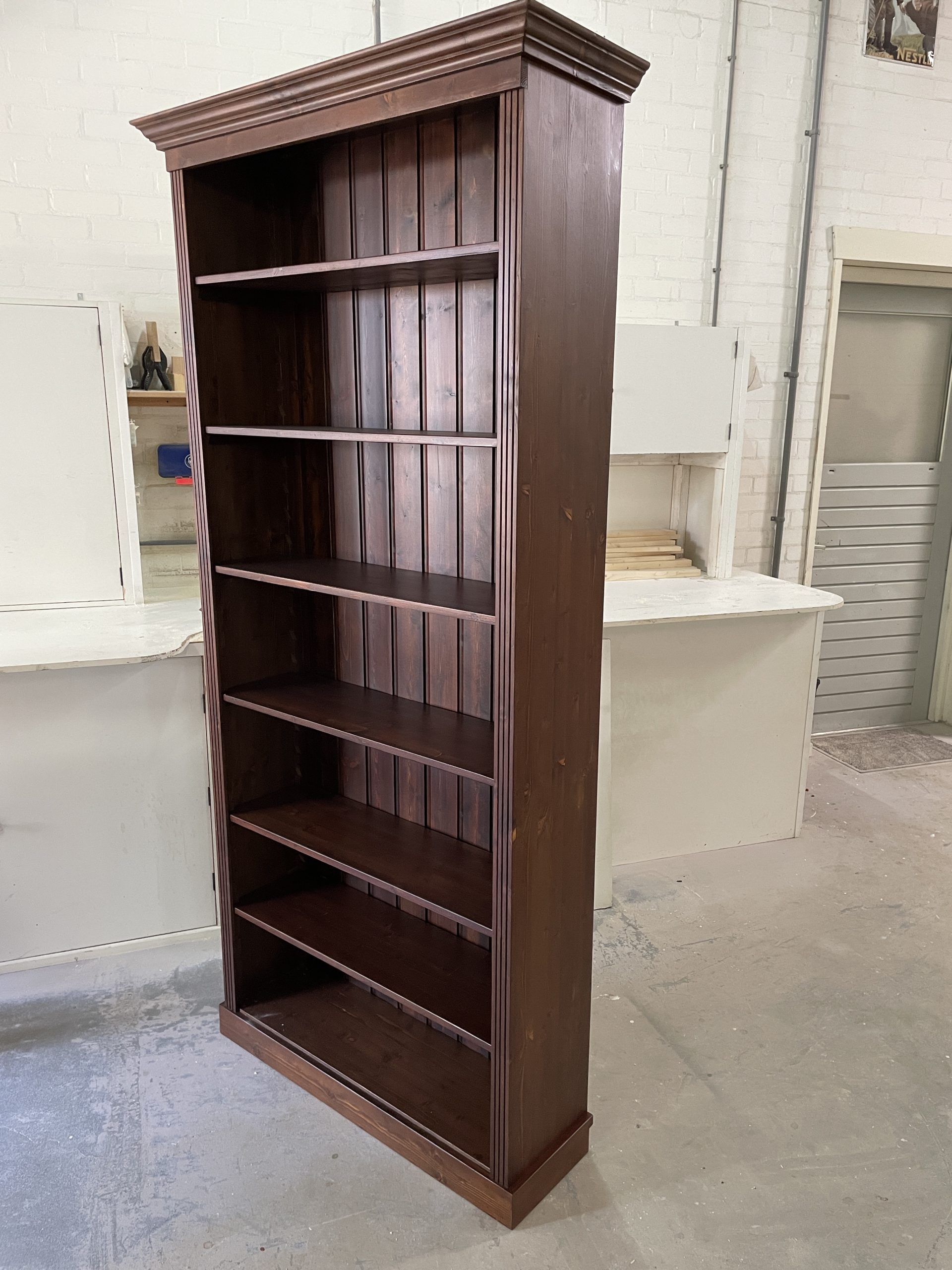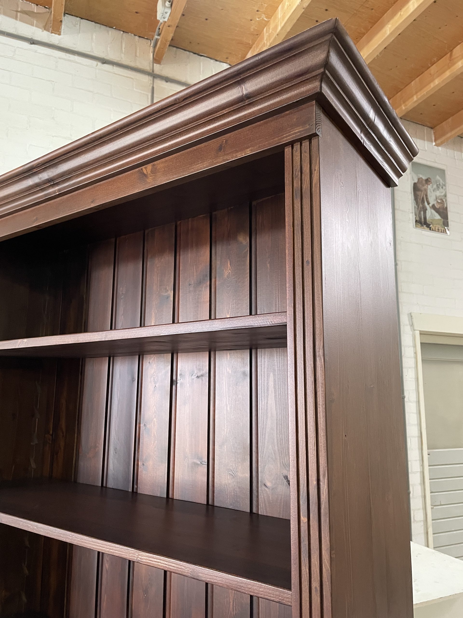 De kast staat op een strakke plintlijst, heeft rillen op de zijstijlen en een geprofileerde koplijst van het model br 50 h 60 mm bovenop. De boekenplanken zijn via een traditioneel houten keeplatten systeem, zoals het vroeger ook gebruikt werd, in hoogte te verstellen. De opgegeven diepte van 30 cm is aan de zijkant gemeten en exclusief uitstekende koplijst aan de voorzijde. Er blijft dan ongeveer 27 cm legplank ruimte in de kast over. De breedte is gemeten bovenaan de kast inclusief de uitstekende koplijst. Koloniaal kleur is er alleen afgewerkt met een lak en niet met was. De originele houtkleur is vrij licht en wordt met een beits donker gekleurd, door de beits te voorzien van een laklaag wordt deze beschermd tegen vocht. Bij een wasafwerking is de kans op lichte vlekken bij deze kleur te groot.