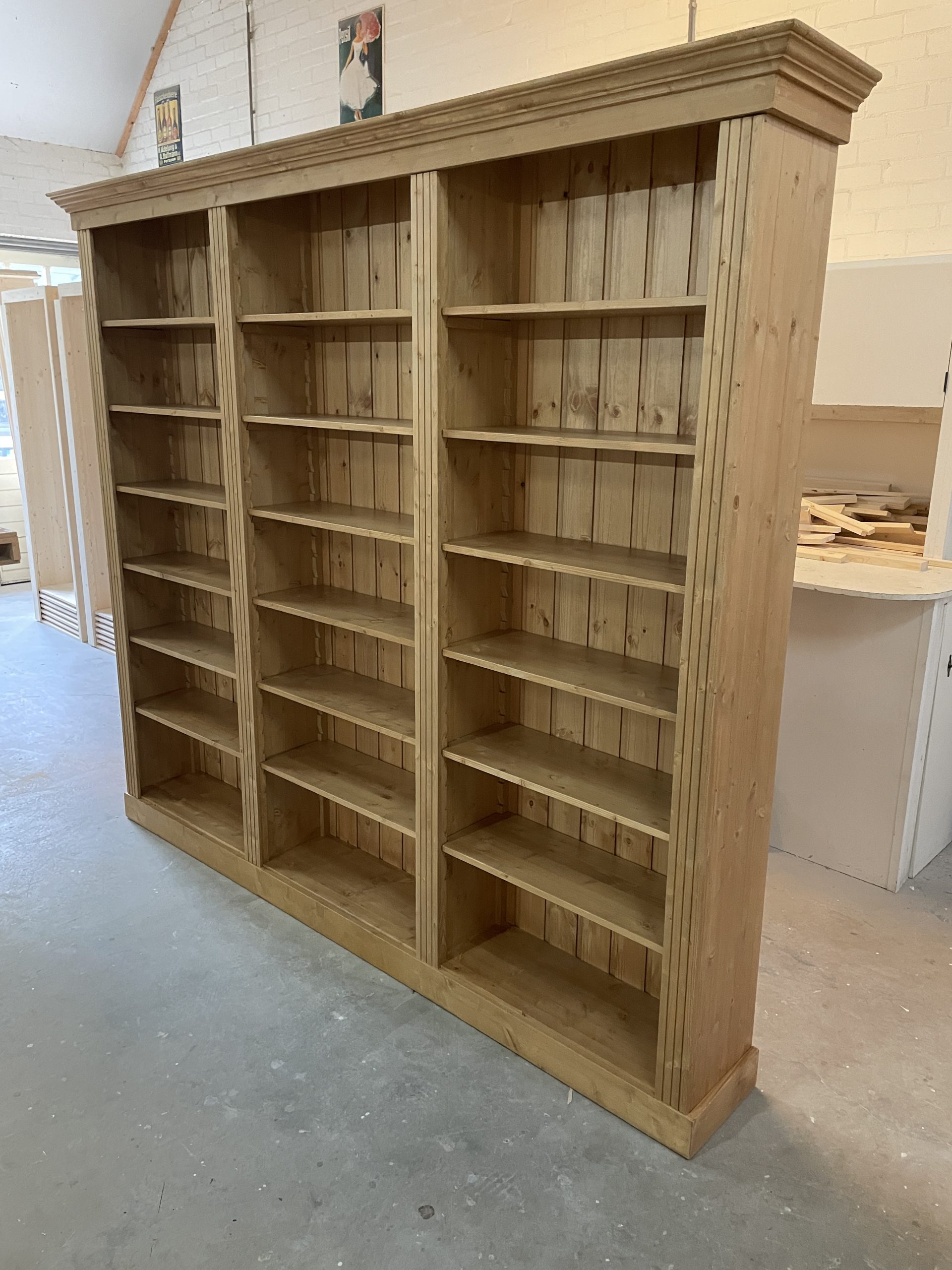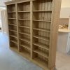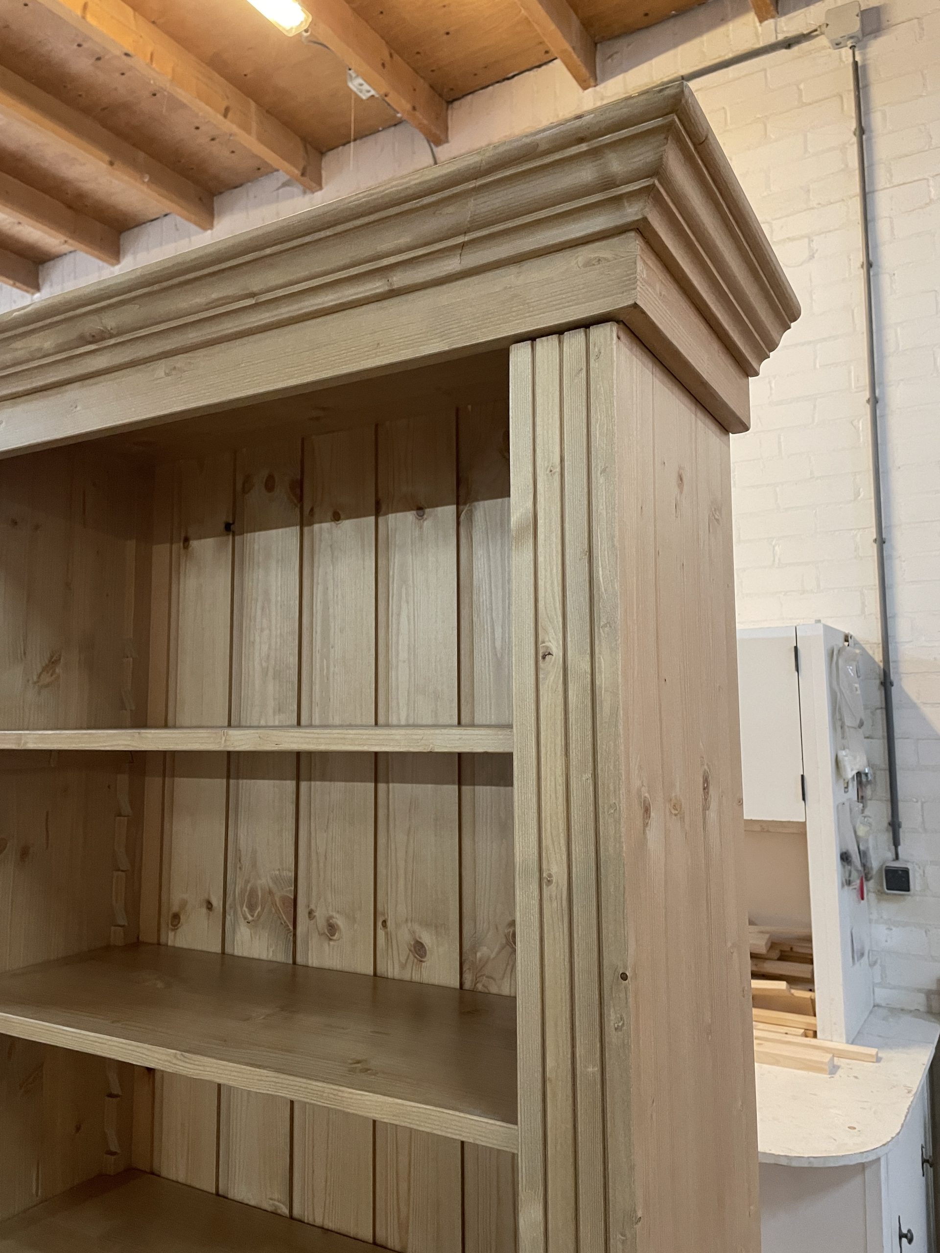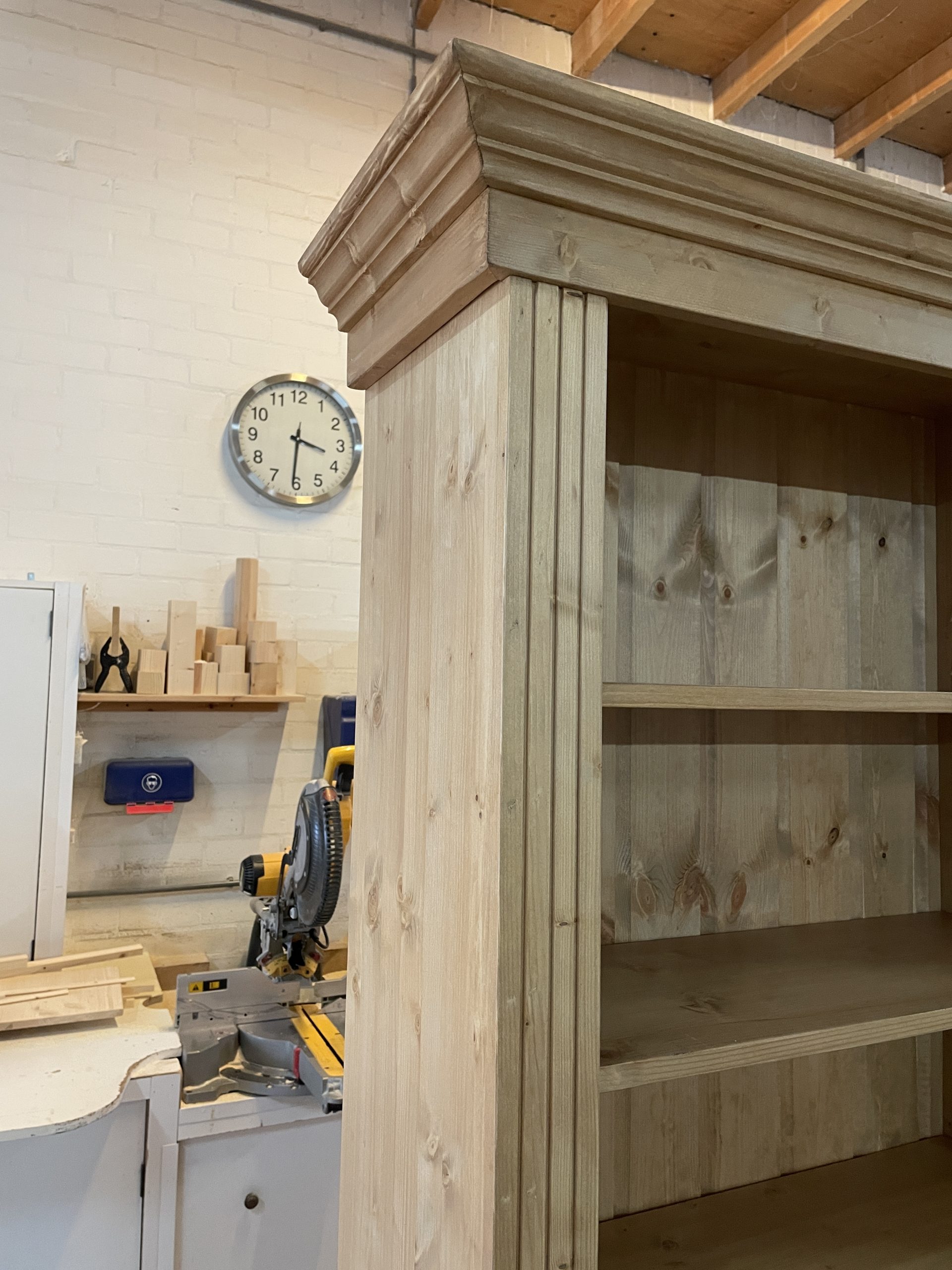 Boekenkast massief hout demontabel gemaakt. Dit model boekenkasten bestaat uit een plintframe, drie losse boekenkast elementen en een framewerk met koplijst te zien op de detailfoto`s. Door deze traditionele bouwwijze is de boekenkast makkelijk in de woning te plaatsen en blijft altijd te verhuizen. We hebben de kast op een strakke plintlijst geplaatst, de zij- en tussenstijlen zijn voorzien van rillen. Bovenaan de kast zit een geprofileerde koplijst model br 50 h 60 mm. De boekenplanken zijn via een traditioneel houten keeplatten systeem in hoogte verstelbaar. We hebben deze boekenkast Almere ook in verschillende andere afmetingen en afwerkingen op de site staan.