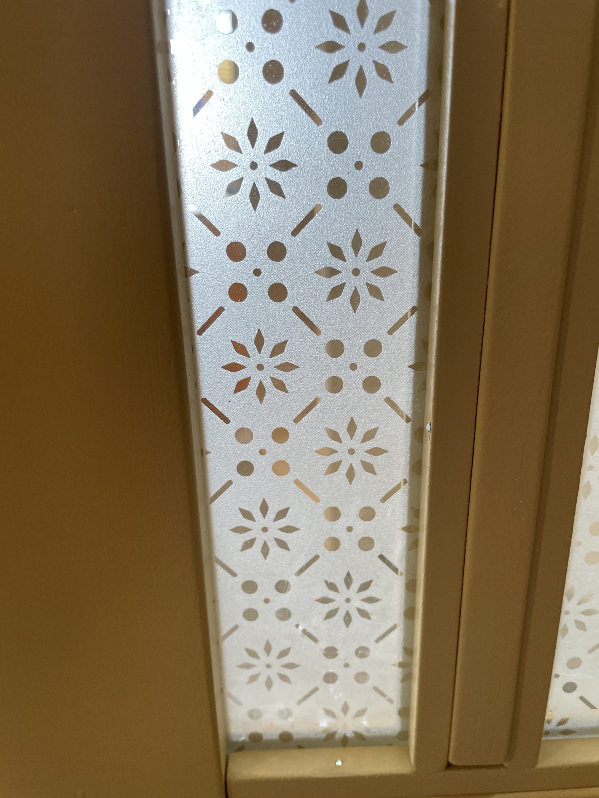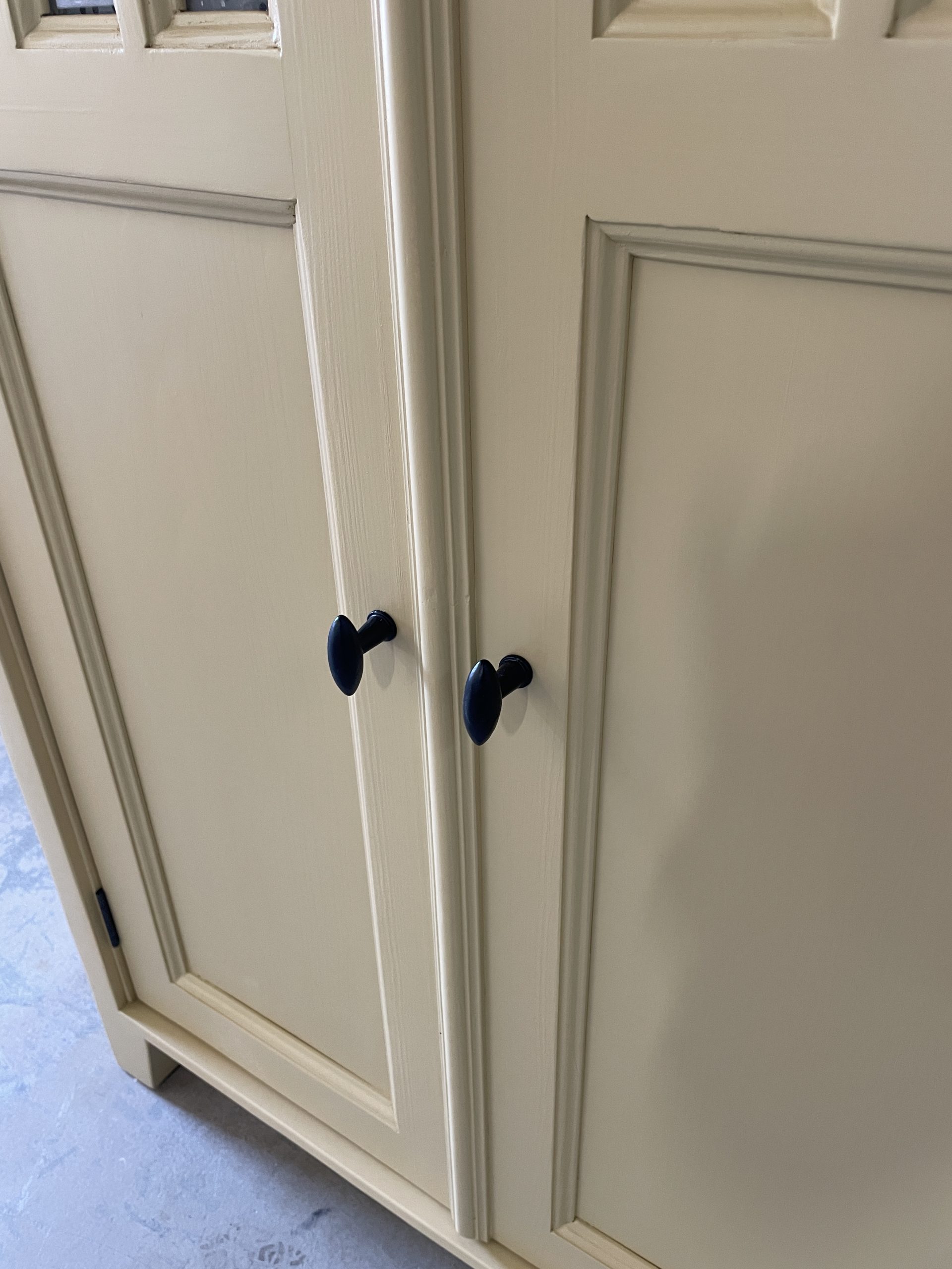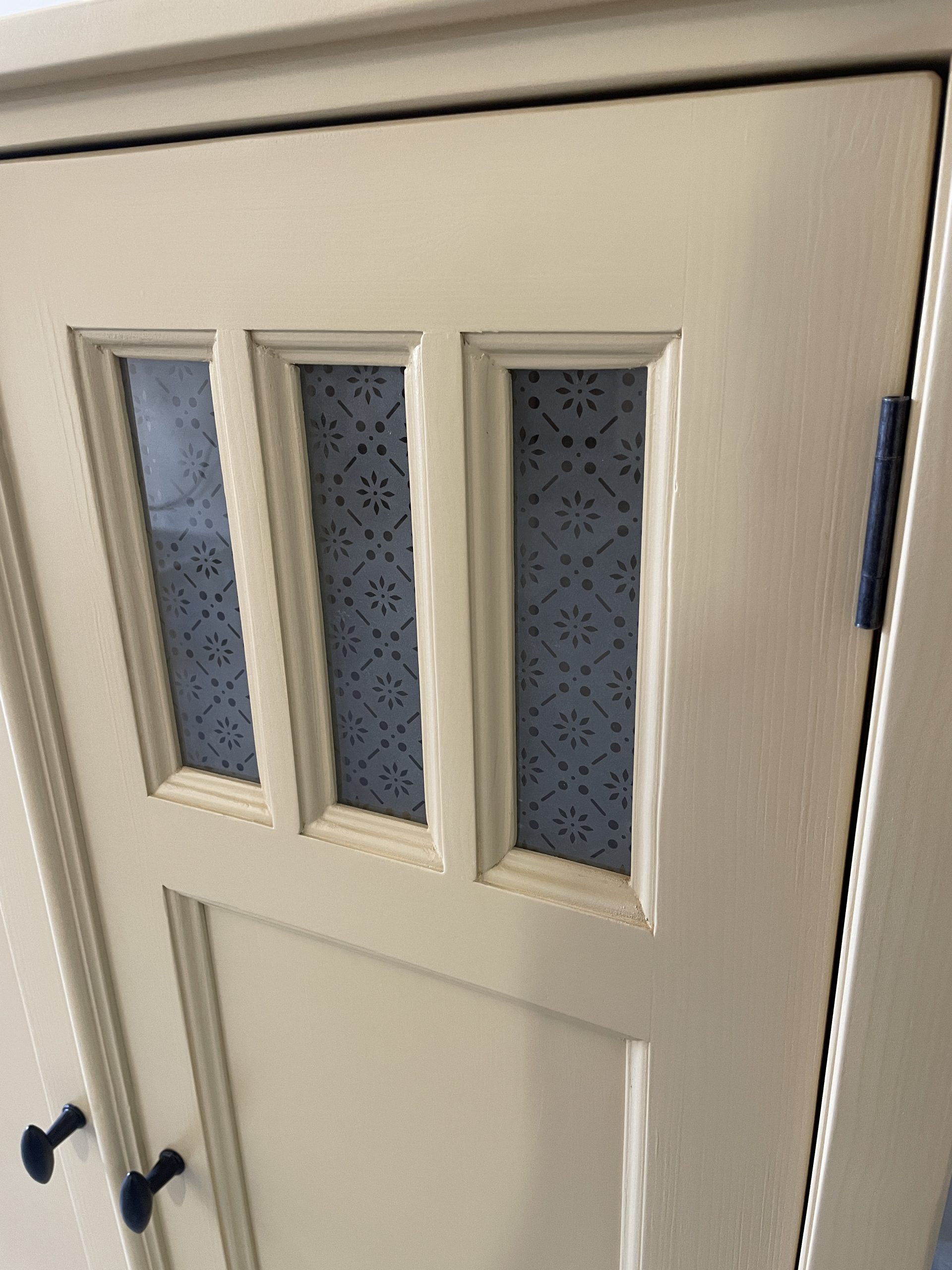 Commode met 2 deuren is voorzien van glasroedes en geëtst Jugendstilglas. De glasroedes geven het meubel een mooie vintage uitstraling, terwijl je profiteert van de voordelen van een nieuw gemaakt meubel.