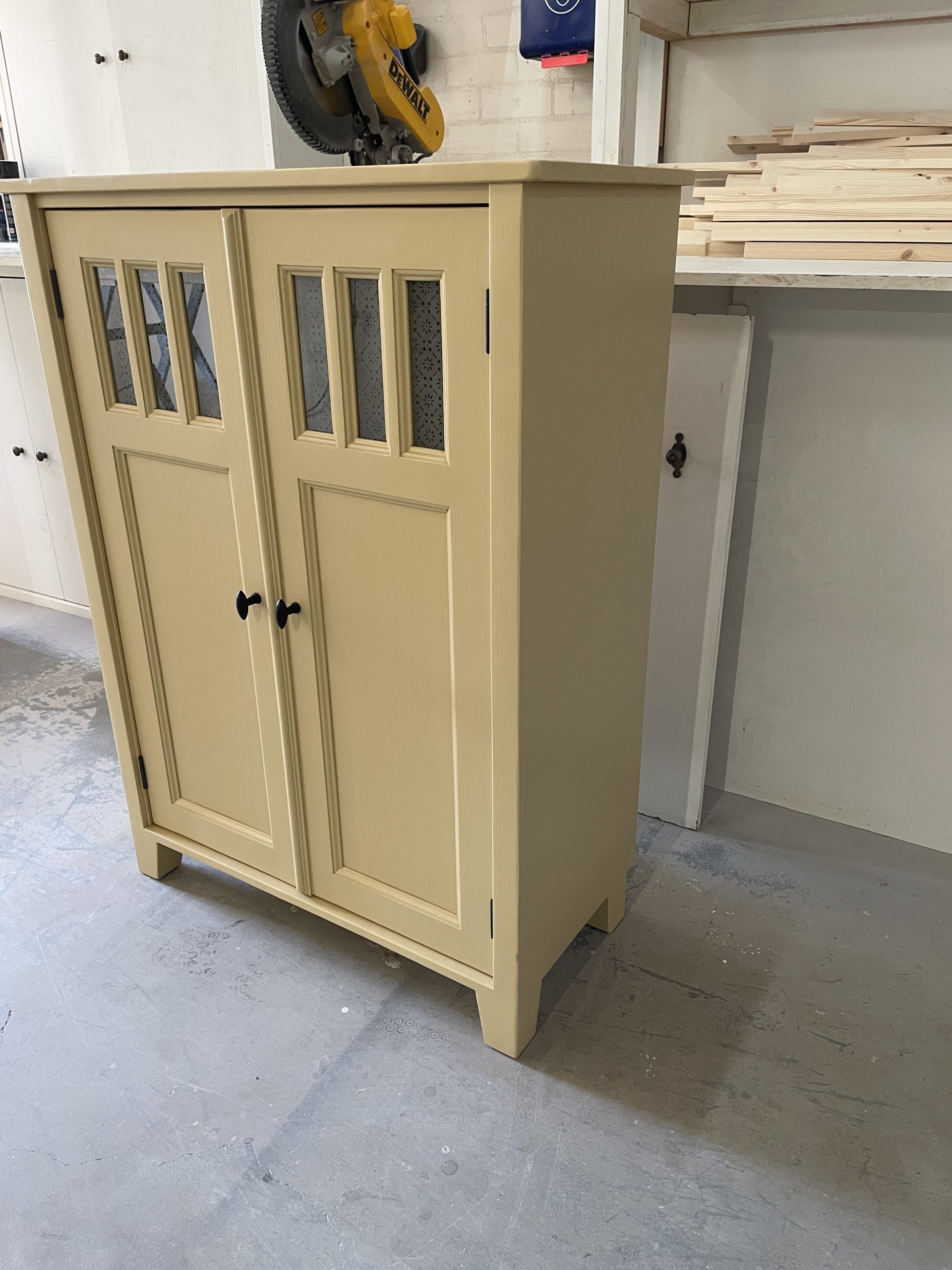 Wil je een voorbeeld zien? Bekijk dan dezelfde commode afgewerkt in RAL 6021: commode deurtjes. We hebben dit model ook al eens gemaakt met andere opties en een andere afwerking: grenen commode deuren. Zoals je ziet zijn er veel mogelijkheden om de commode met 2 deuren volledig naar jouw wensen samen te stellen.