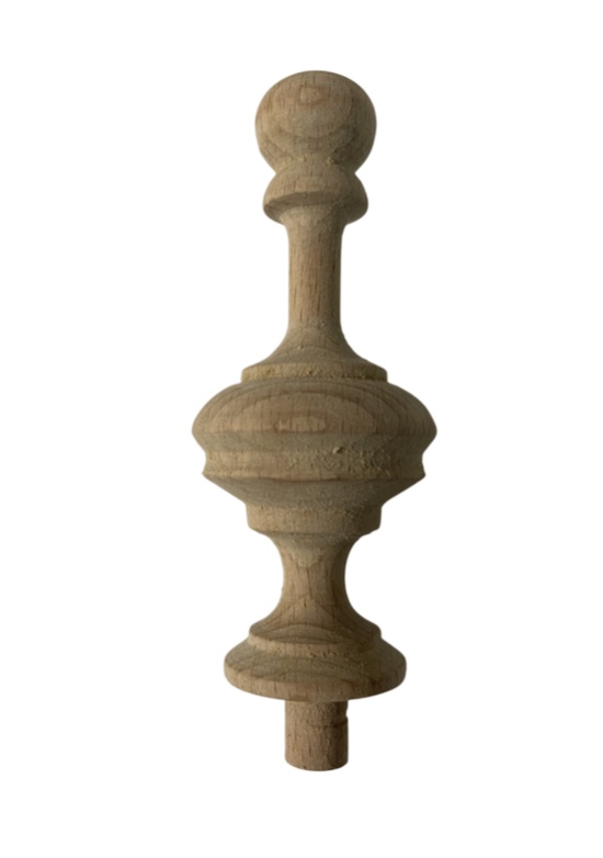 Gedraaide toren die je terugvindt bij meubelen uit de Louis Philippe stijl,. In het midden een kroonlijst en op de hoeken van de kast deze gedraaide torentjes. In sommige gevallen zie je ze ook terug op klokken. Deze gedraaide torens zijn nog onbehandeld en kunnen dus afgewerkt worden in elke gewenste kleur. Voor het kleuren van hout gebruiken we waterbeits en dat werken we vervolgens af met meubelwas of lak. Het gedraaide torentje heeft een houten stift die een doorsnee heeft van 10 mm. De hoogte van de gedraaide toren s 11 cm, zonder de stift. Op de detailfoto staat een oude Louis Philippe secretaire afgebeeld met een kroonlijst dezelfde torentjes op de hoeken.