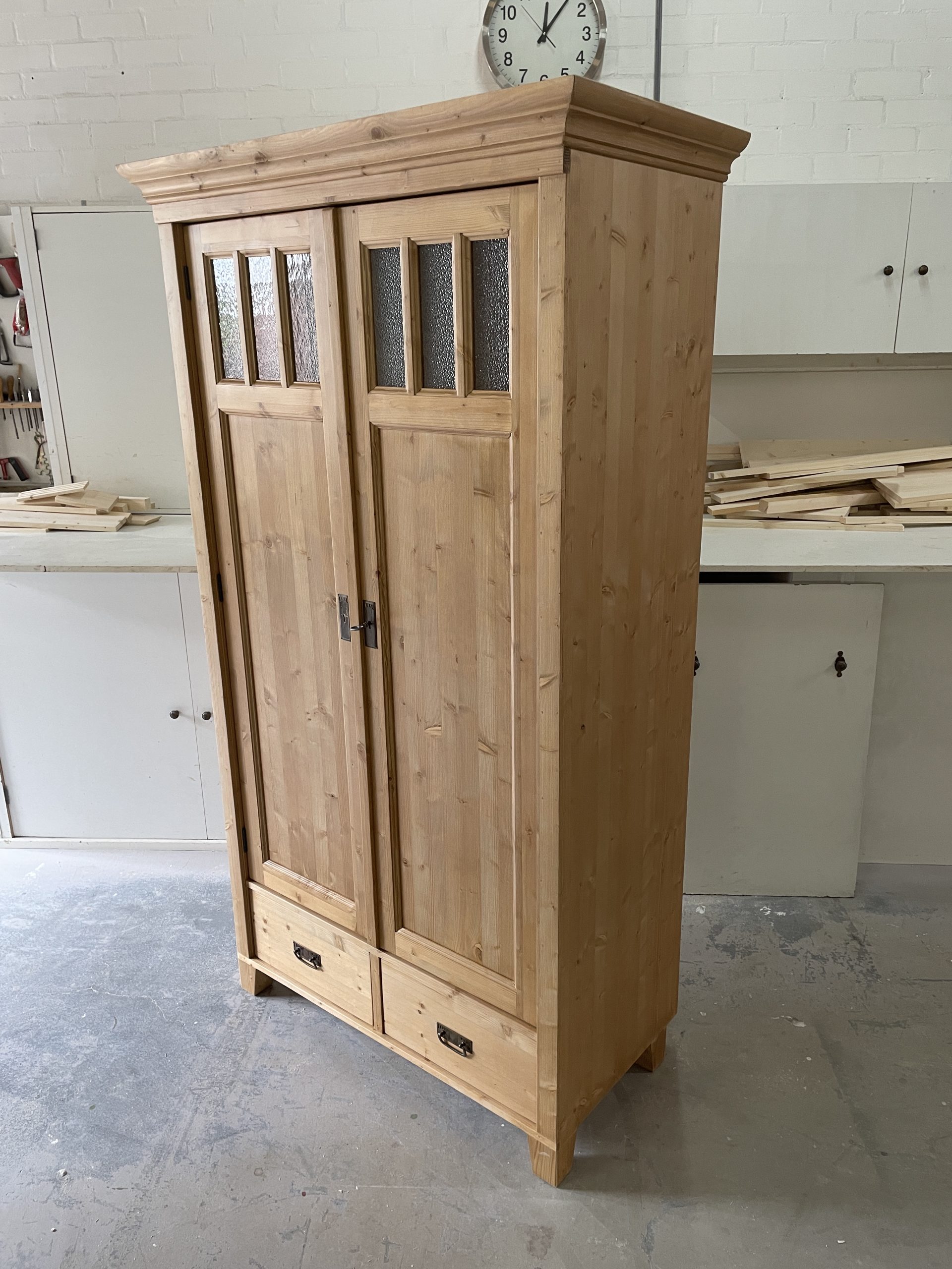 Deze geloogd grenen kasten worden in onze meubelmakerij op maat gemaakt waarbij je de keuze hebt uit verschillende opties. De meubelen worden met de hand op ambachtelijke wijze vervaardigd en afgewerkt. Er wordt alleen gebruikgemaakt van massief hout, ook voor de achterwand en bodems in de laden. Op deze pagina krijg je meer uitleg over de diverse meubelopties. Wil je liever een kast die wat lager is dan zijn meidenkasten eventueel een optie, hier kun je een voorbeeld zien: grenen meidenkast met ruitjes.