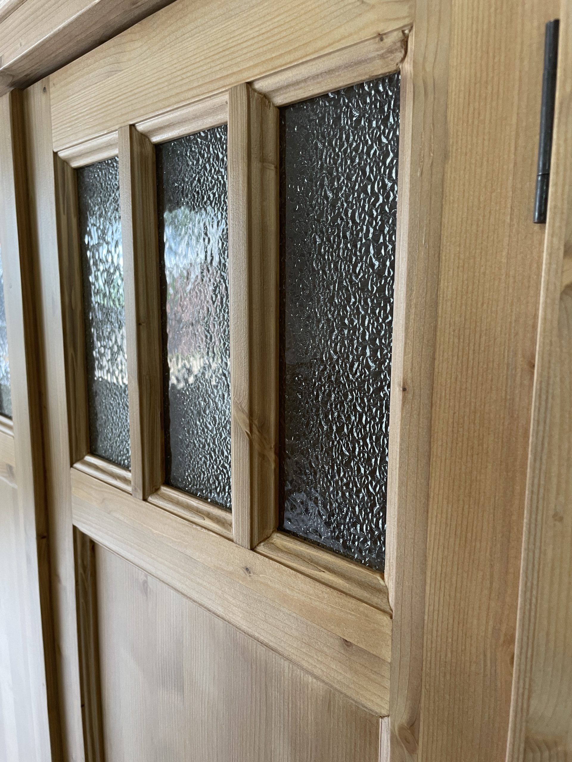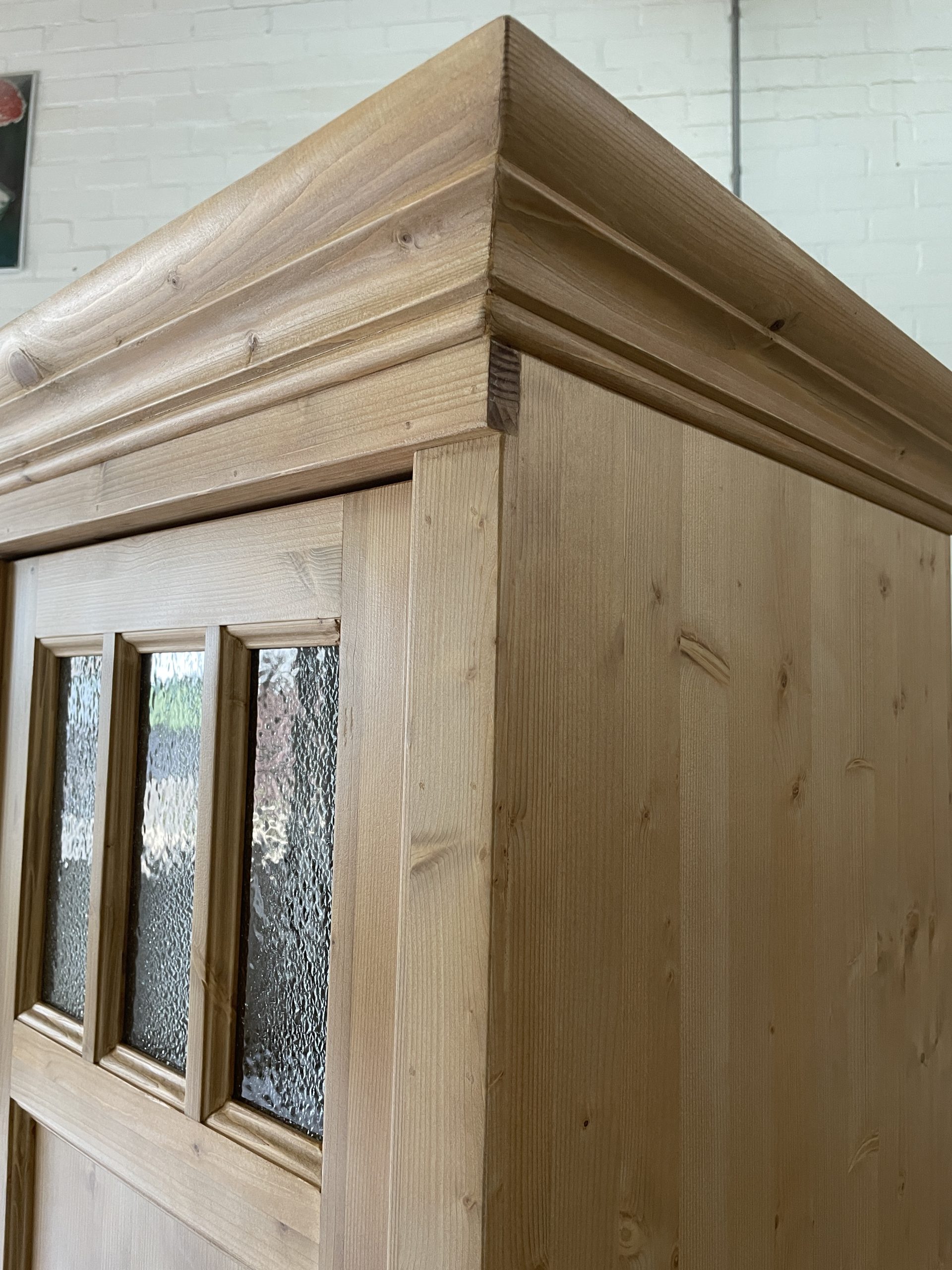 Geloogd grenen kast ingericht met vier legplanken die in hoogte te verstellen zijn. Deze massief houten kast staat op tapse poten en heeft onderin twee laden. De strakke glasroede deuren zijn voorzien van gebobbeld glas en hebben een freesrandje in de stijllijsten. De deuren openen met behulp van een slot en sleutel, de laden met behulp van oud messing meubelgrepen. We hebben een sierlijke, geprofileerde koplijst aangebracht en de linnenkast een natuurlijk houttint gegeven met waterbeits, kleur geloogd grenen en afgewerkt met matte lak. De diepte van de kast is achter de deuren 44 cm.