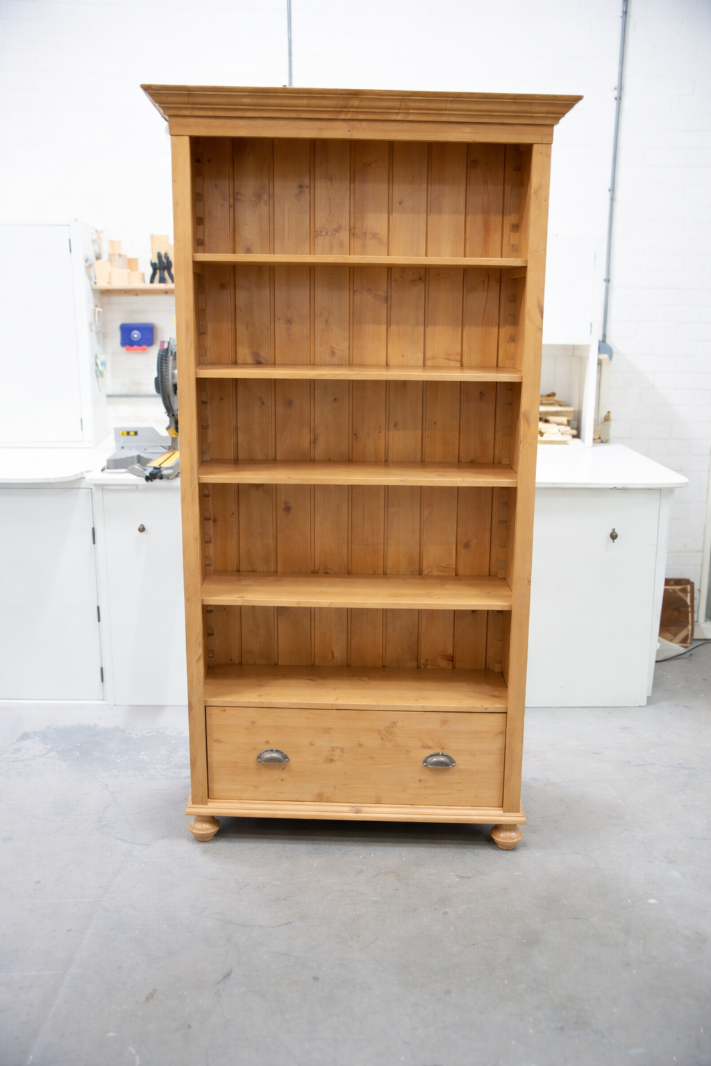 Een grenen boekenkast zoals het getoonde model wordt op maat gemaakt en kan geheel naar jouw wensen worden uitgevoerd waarbij je de keuze hebt uit verschillende opties. In onze eigen meubelmakerij worden de meubelen met de hand op ambachtelijke wijze vervaardigd en afgewerkt. Er wordt alleen gebruikgemaakt van massief hout, ook voor de achterwand en bodems in de laden.