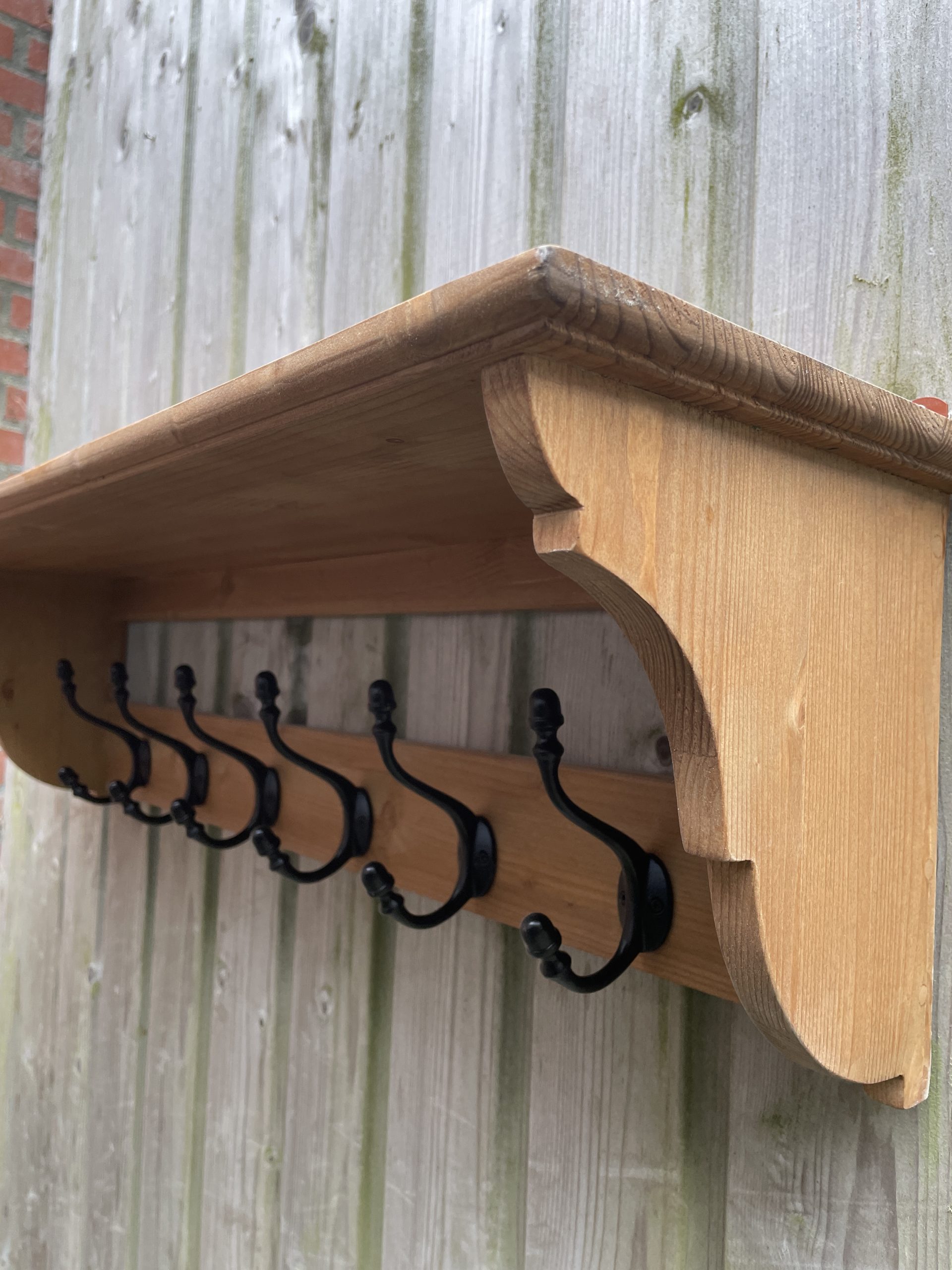 Grenen kapstok met zes zwarte mooi gedetailleerde kapstokhaken. Deze kapstok is niet alleen functioneel maar ook zeer decoratief in de hal, de keuken, de badkamer en de slaapkamer. Met deze mooie kapstok krijgt je interieur een Scandinavisch tintje. De kapstok is afgewerkt in een oud grenen kleur mat lak. Door deze afwerking is de kapstok beschermd tegen vocht, bijvoorbeeld van natte jassen of mutsen, en voor het onderhoud kun je hem met een vochtige doek schoonmaken. De kapstok heeft sierlijk uitgewerkte consoles en de hoedenplank heeft een geprofileerde rand. In de keuken of badkamer biedt het ”hoedenplankje” extra opbergruimte, gebruik hem dus waarvoor je wilt.