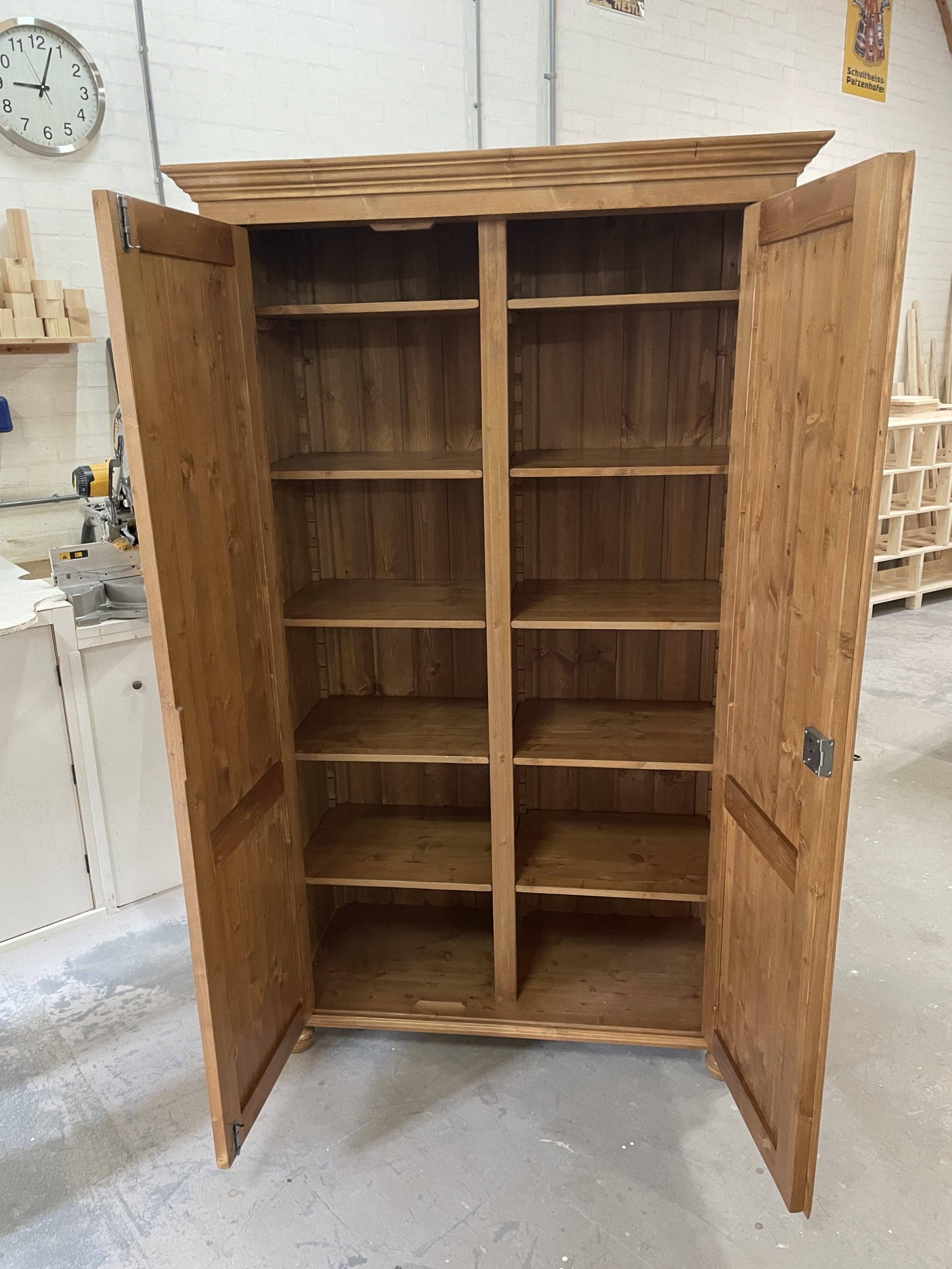 Klassieke houten kast met twee mooie bossing paneel deuren. De term bossing verwijst naar de uitvoering van het houten paneel, bossing is de schuin afgewerkte rand van een paneel bij een deur. Bij langere deuren zoals dit model kast ze heeft werken we altijd met twee panelen en een dwars stijl in de deur. We houden meestal een verhouding van 1/3 houten paneel onder en 2/3 houten paneel boven aan zoals het vroeger ook standaard was bij dit soort klassieke kasten. Op verzoek van de klant hebben we als indeling een verticaal schot geplaatst. De legplanken aan de linker en rechterkant zijn zo via traditionele houten keeplatten individueel in hoogte verstelbaar. Uiteraard kun je er ook voor kiezen het verticale schot weg te laten zodat de legplanken over de hele breedte van de kast lopen.