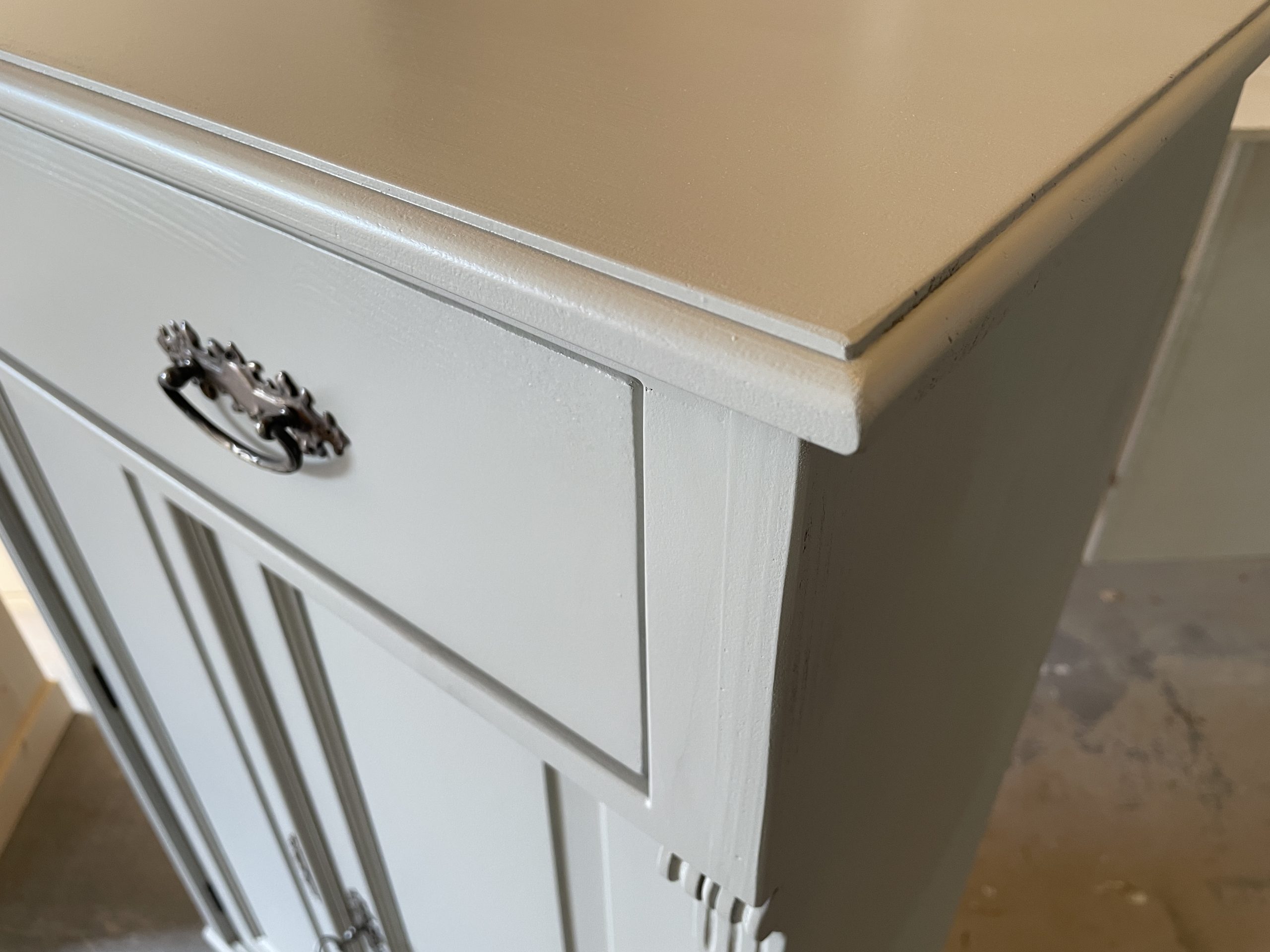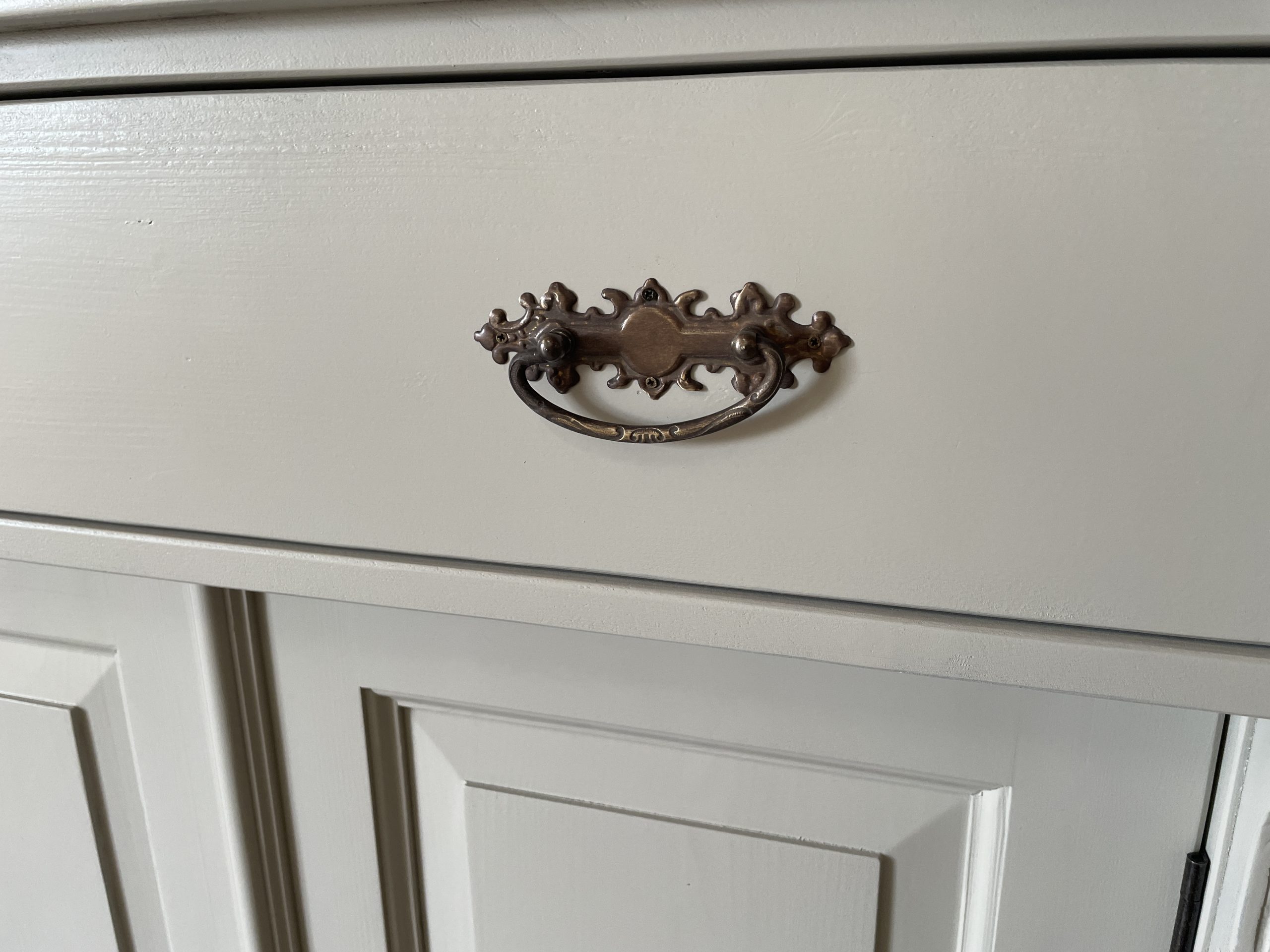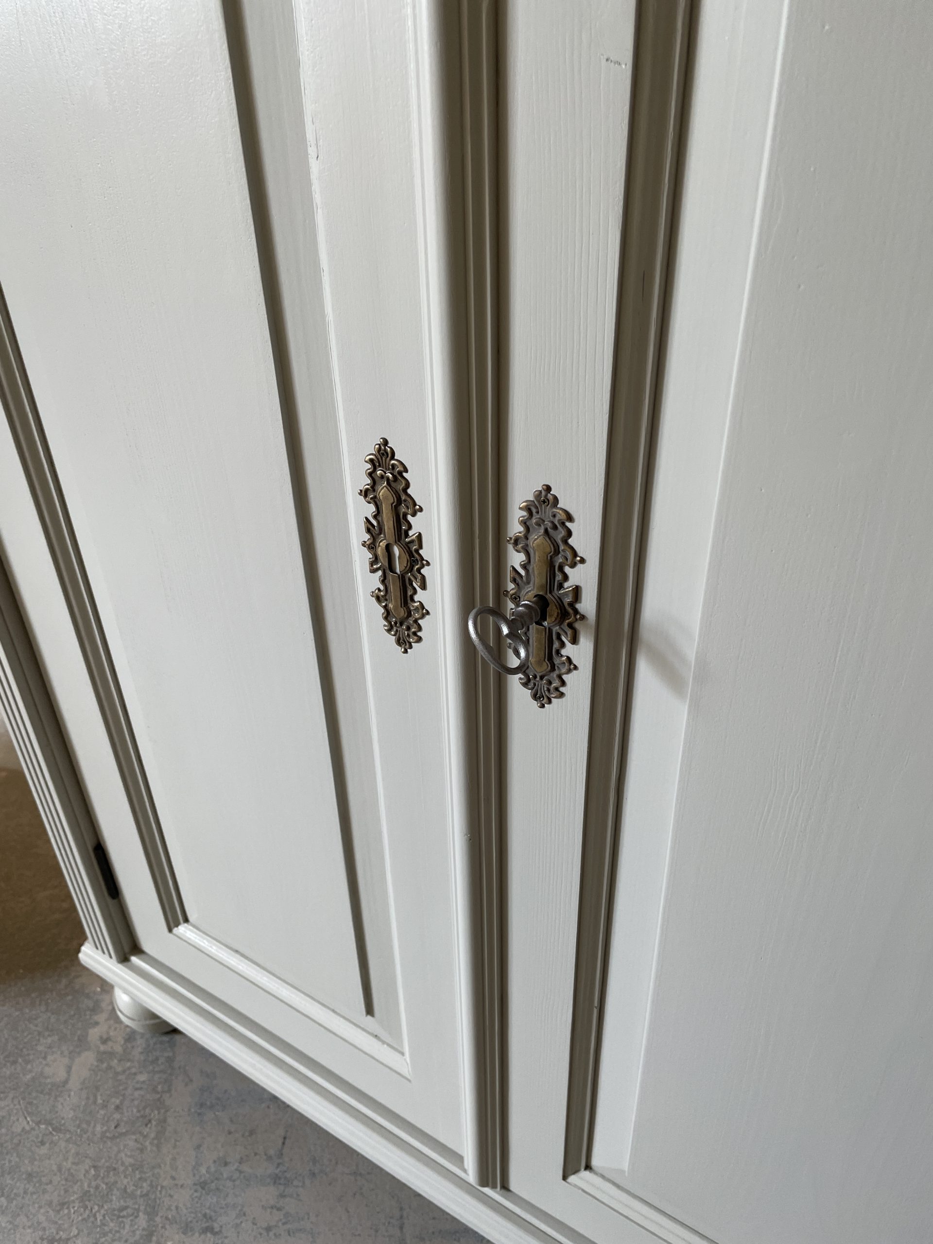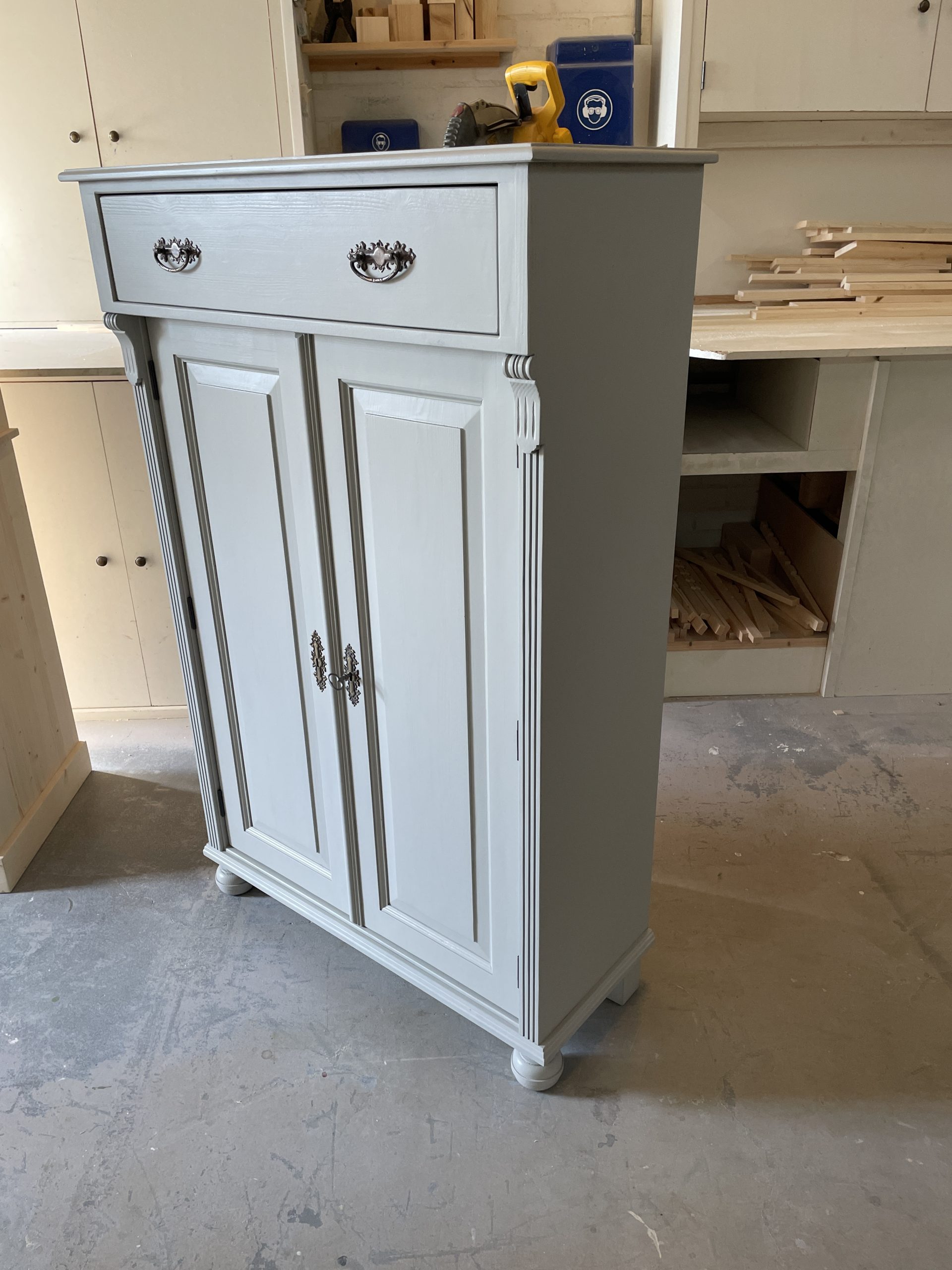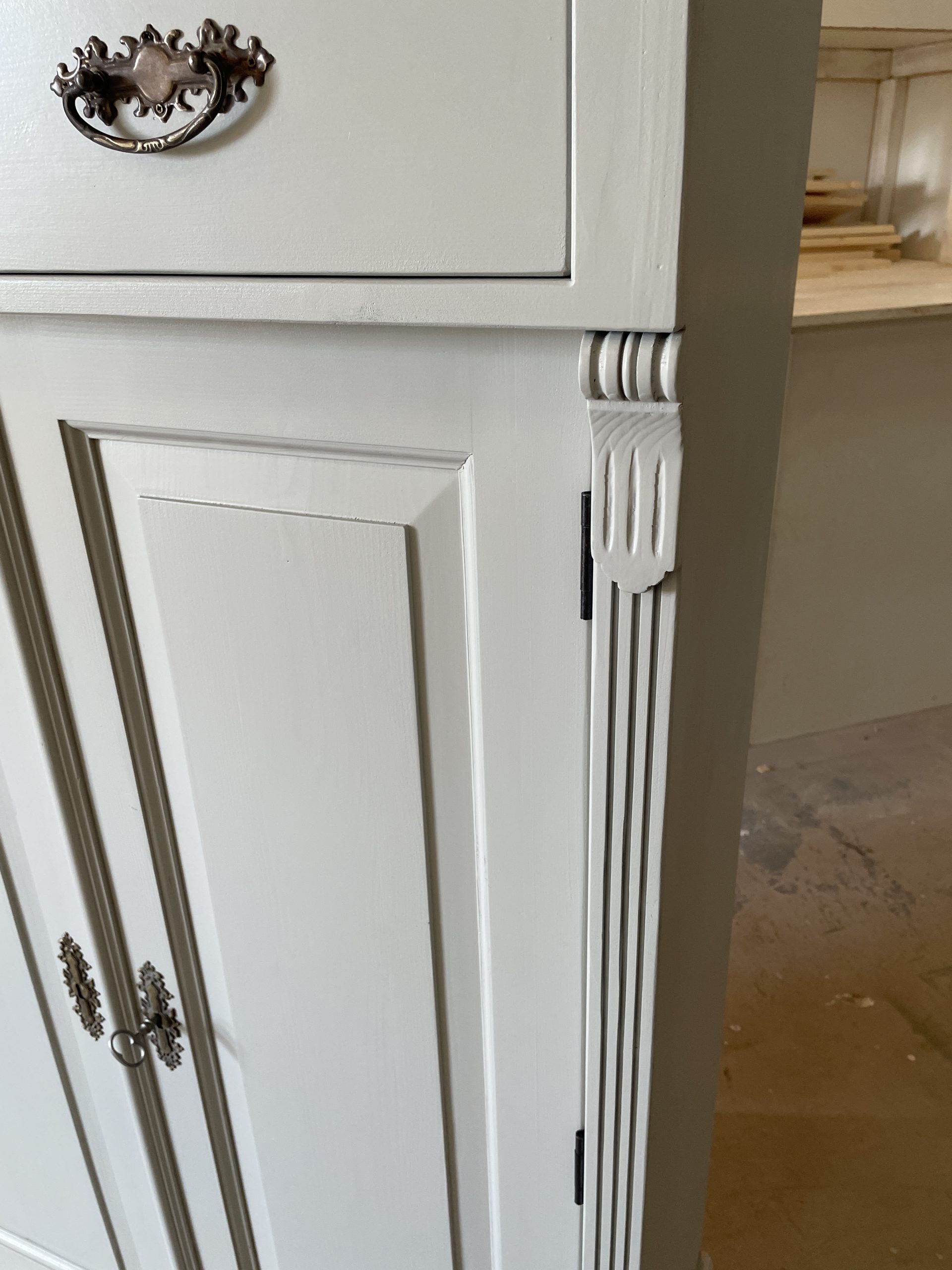 Klassieke meidenkast op maat gemaakt naar een bestaand antiek model, een vertiko uit de Gründerzeit periode. Een stijlperiode die van ongeveer 1870 tot 1910 liep. Kenmerkende stijlelementen van deze periode waren onder andere het gebruik van bolpoten, rillen en ornamenten op de zijstijlen. Sierlijke bossing gepaneelde deuren en een sierlijke freesrand om het blad. Details zoals traditionele meubelsloten en meubelgrepen leveren allemaal een bijdrage aan de romantische landelijke uitstraling van deze meidenkast. De meidenkast heeft traditionele houten keeplatten waardoor de legplanken eenvoudig in hoogte verstelbaar zijn. De lade boven is ongeveer 13 cm hoog.