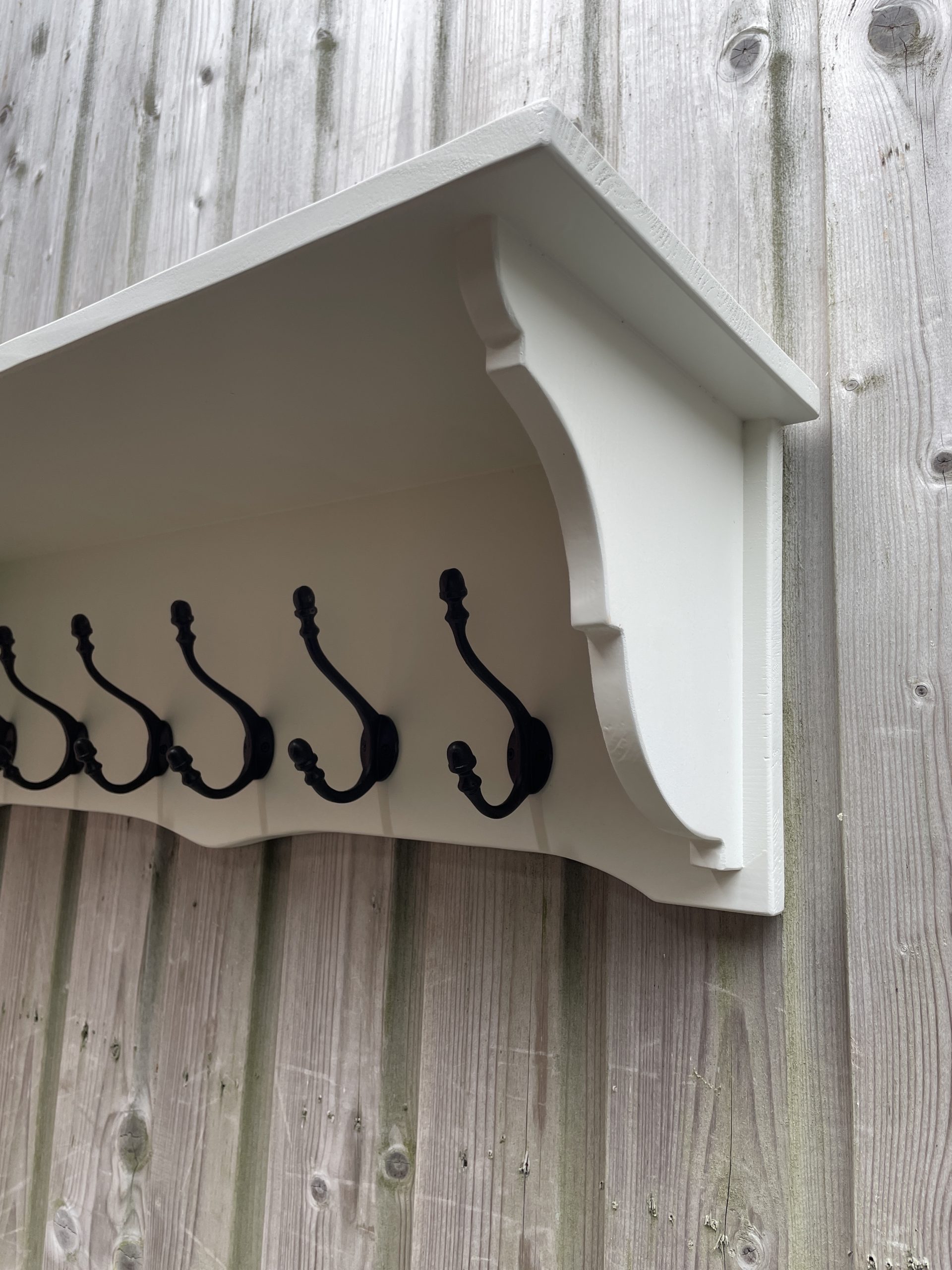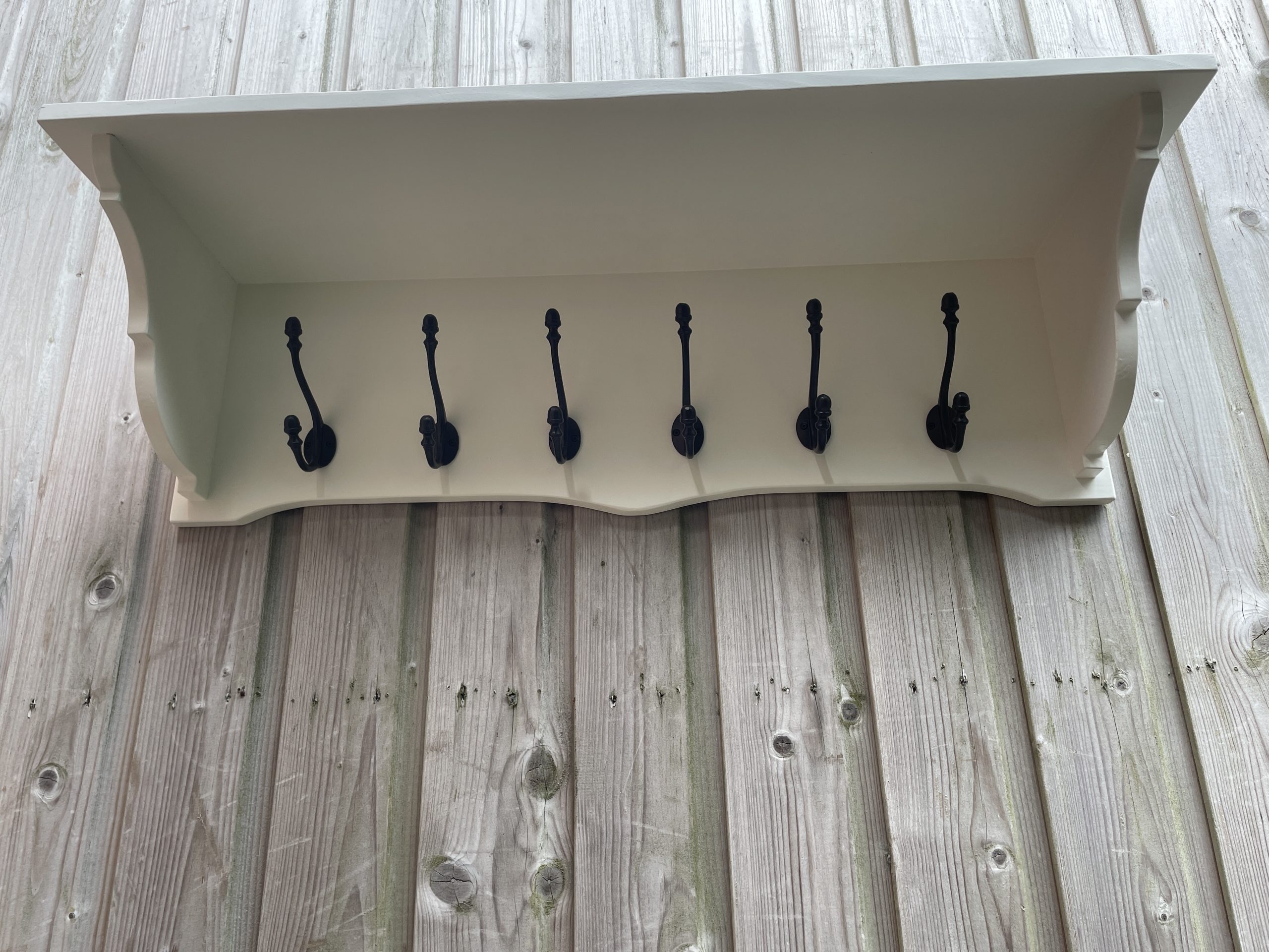 Landelijke wandkapstok wit van kleur en 90 cm breed met 6. zwarte ijzeren kapstokhaken. Compact en handig, zo’n kapstok waaraan je jassen, sjaals, tassen en mutsen kwijt kunt bij het binnenkomen. Maar ook zonder jassen en sjaals is het belangrijk dat de kapstok er mooi uitziet zodat hij ook zonder intensief gebruik nog een prachtige toevoeging is aan je interieur. Functioneel en decoratief, deze landelijke wandkapstok past helemaal in de landelijke woonstijl. Het handige plankje kun je gebruiken om bijvoorbeeld handschoenen op te leggen. Dit plankje noemen ze een hoedenplank en diende in lang vervlogen tijden on de diverse hoofdbedekkingen op te leggen. Deze wandkapstok is er ook in een smallere uitvoering in een iets ander model met andere kapstokhaken: landelijke kapstok 80 cm en in een 65 cm brede uitvoering: charmante landelijke kapstok.
