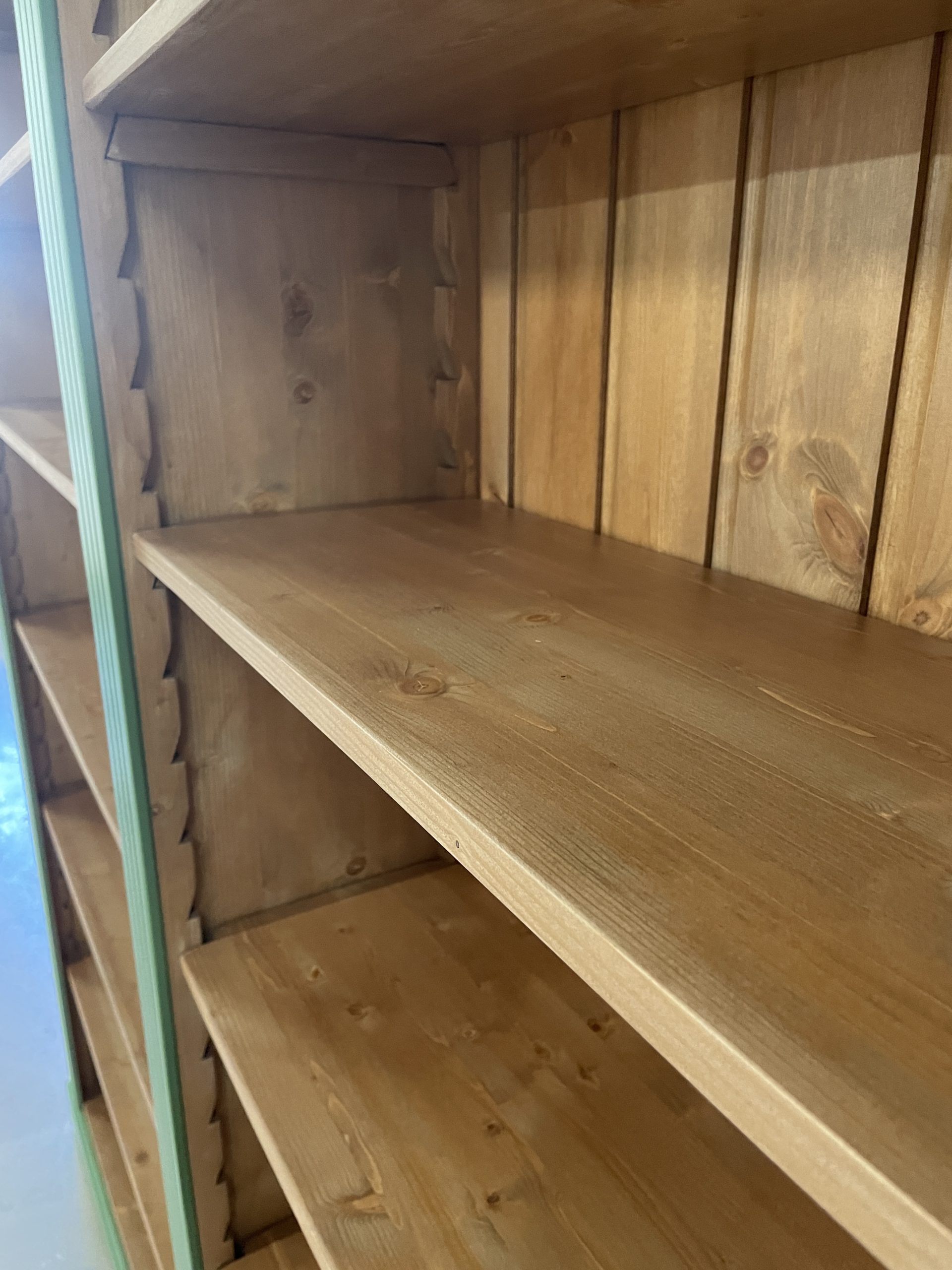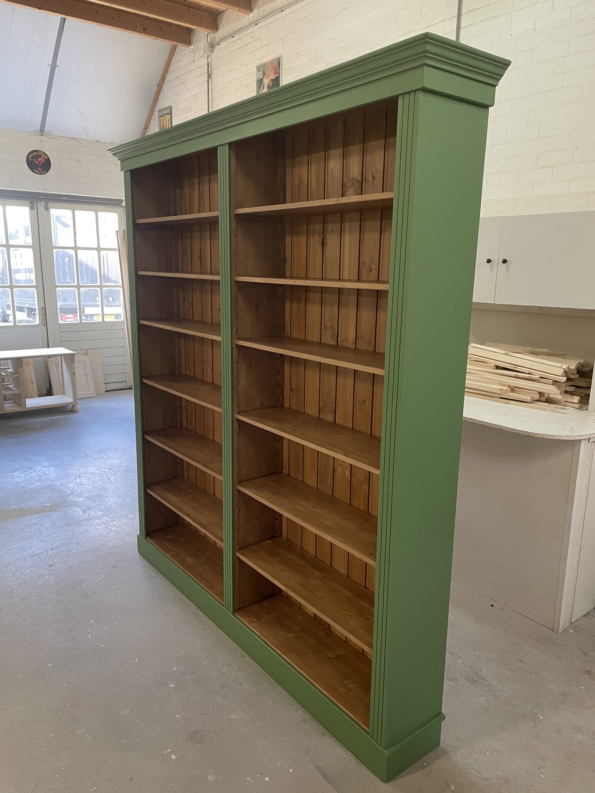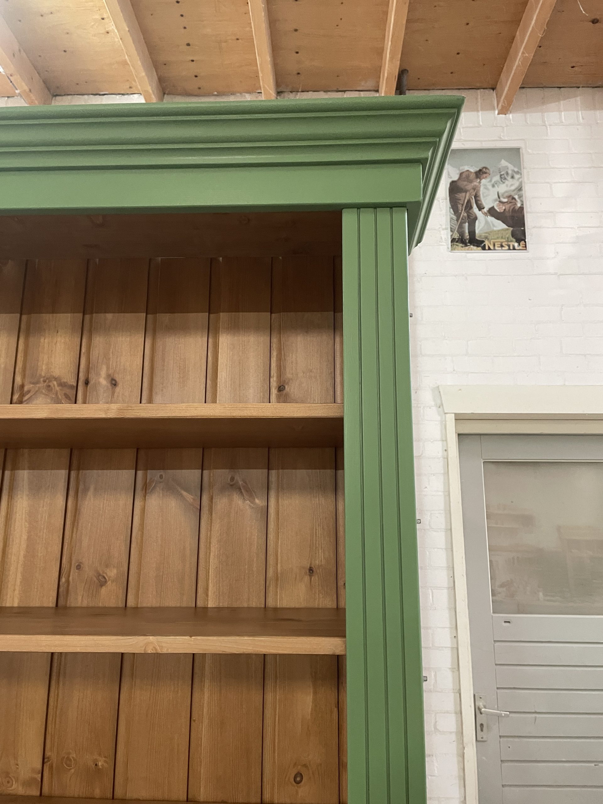 Een open kast in de woonkamer is niet alleen praktisch, maar kan ook een echte blikvanger zijn. Dit model kenmerkt zich door een stijlvolle combinatie van verf in RAL 6011 en een warme houtkleur aan de binnenzijde. In dit geval is gekozen voor antiek grenen met een matte lakafwerking, wat zorgt voor een tijdloze en sfeervolle uitstraling.