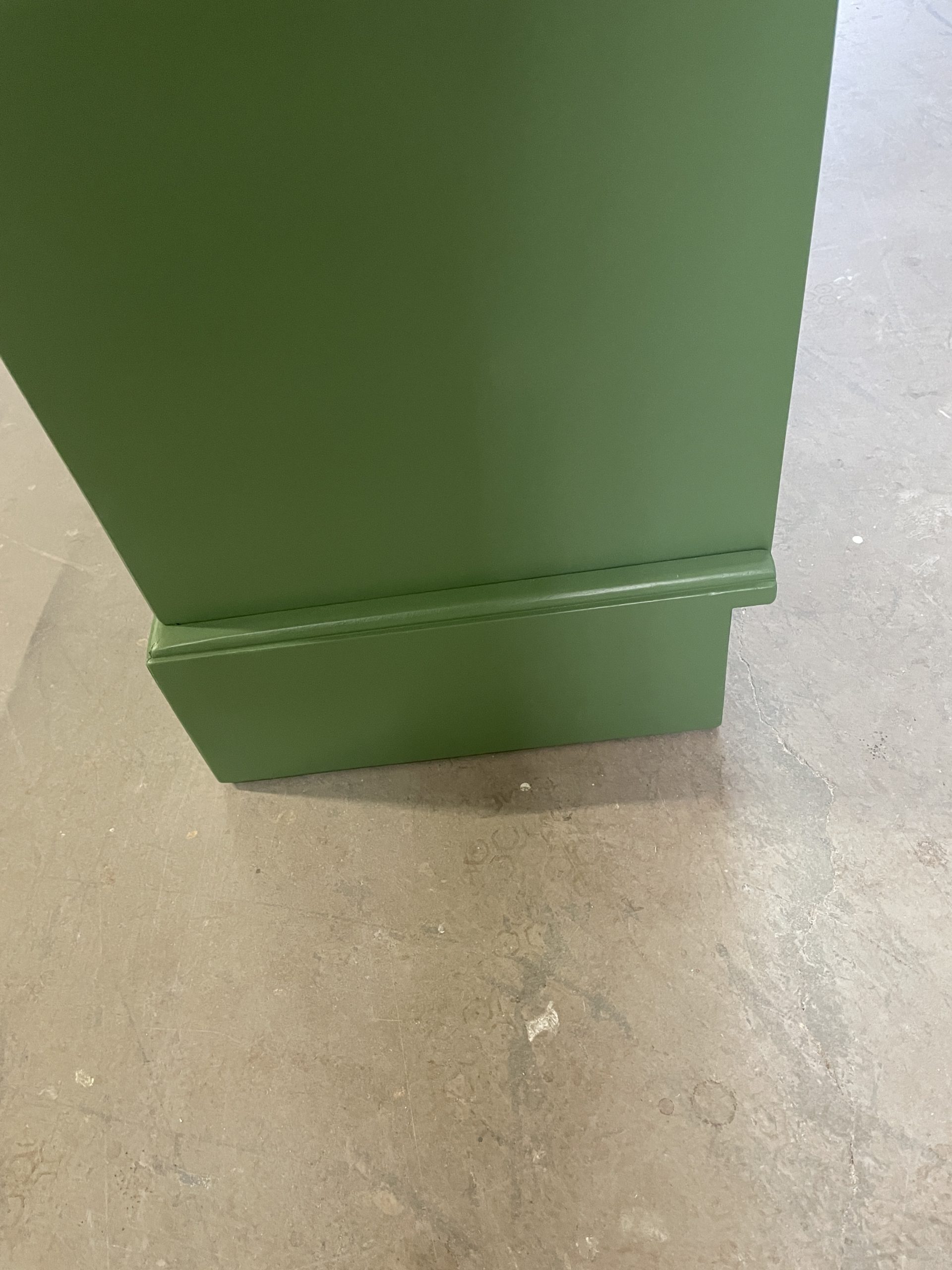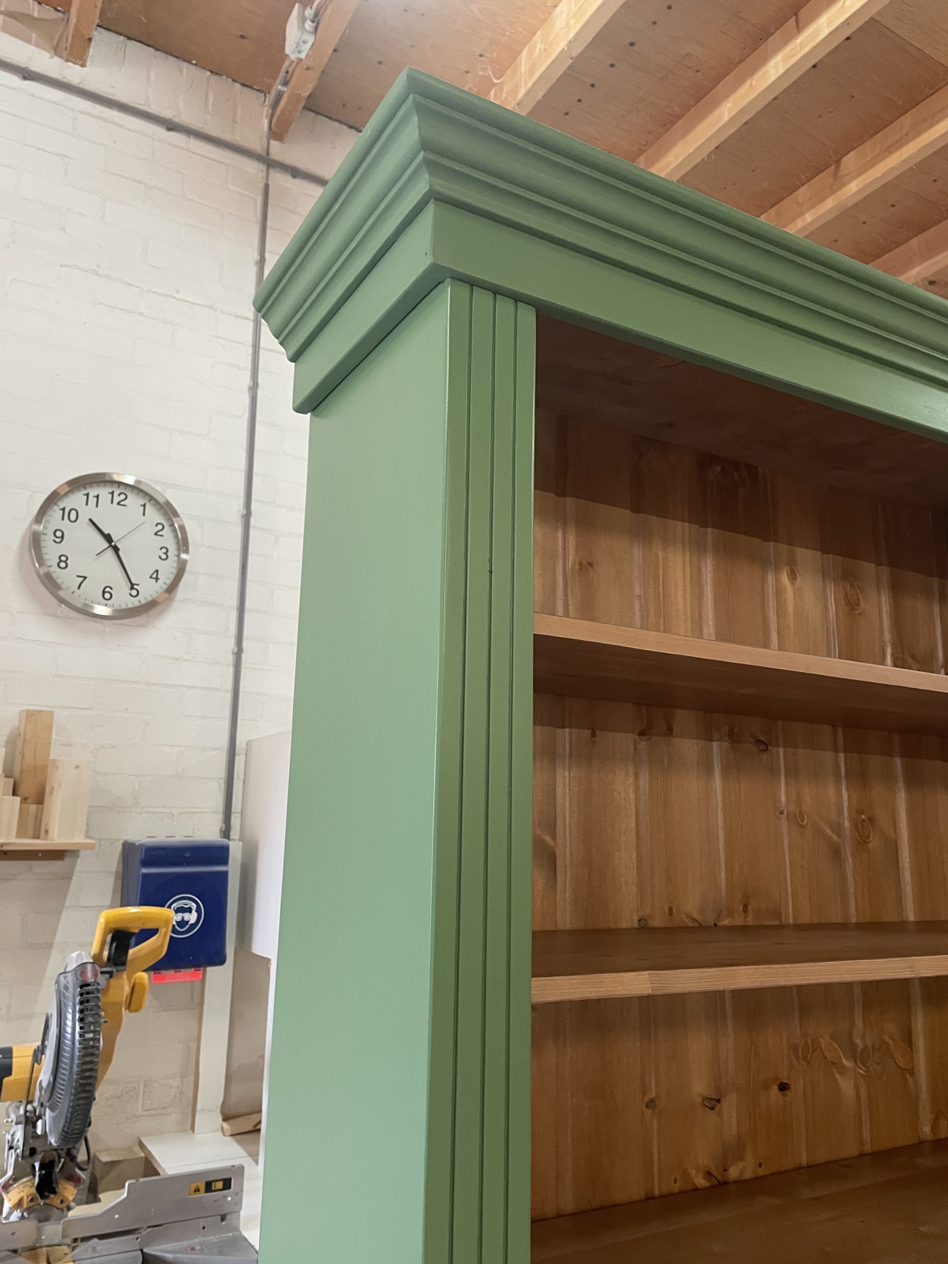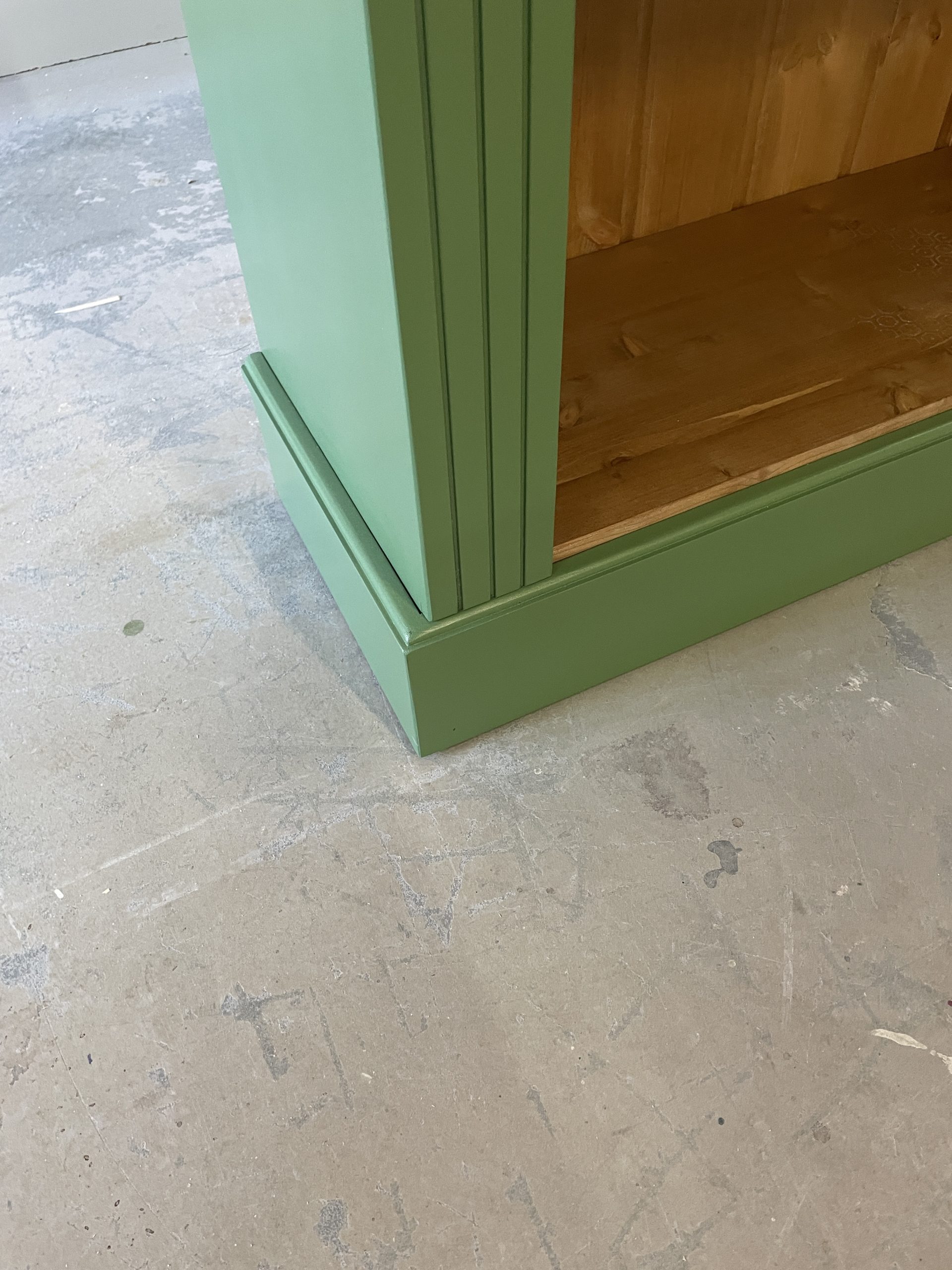 Een open kast in de woonkamer is niet alleen praktisch, maar kan ook een echte blikvanger zijn. Dit model kenmerkt zich door een stijlvolle combinatie van verf in RAL 6011 en een warme houtkleur aan de binnenzijde. In dit geval is gekozen voor antiek grenen met een matte lakafwerking, wat zorgt voor een tijdloze en sfeervolle uitstraling.