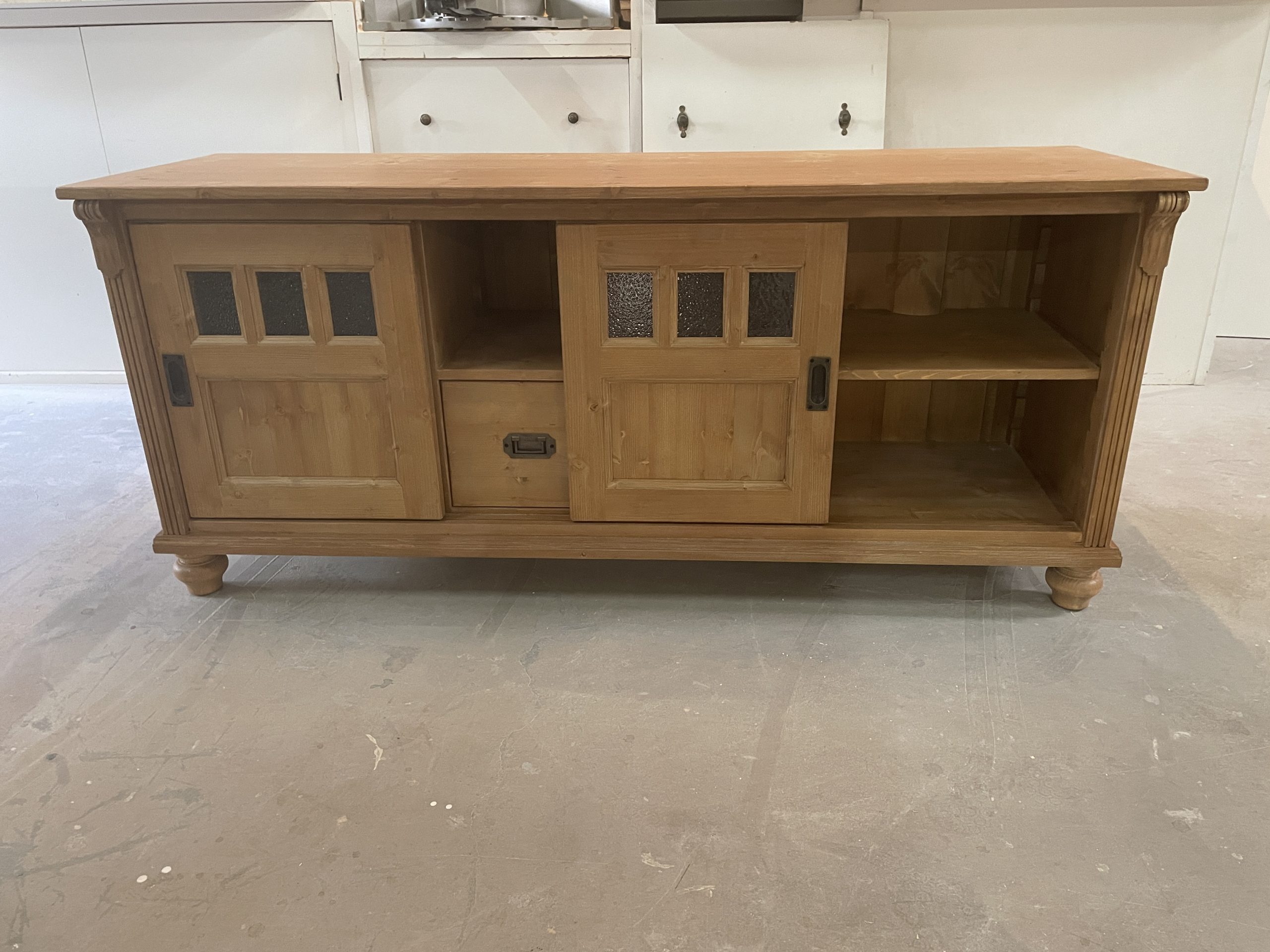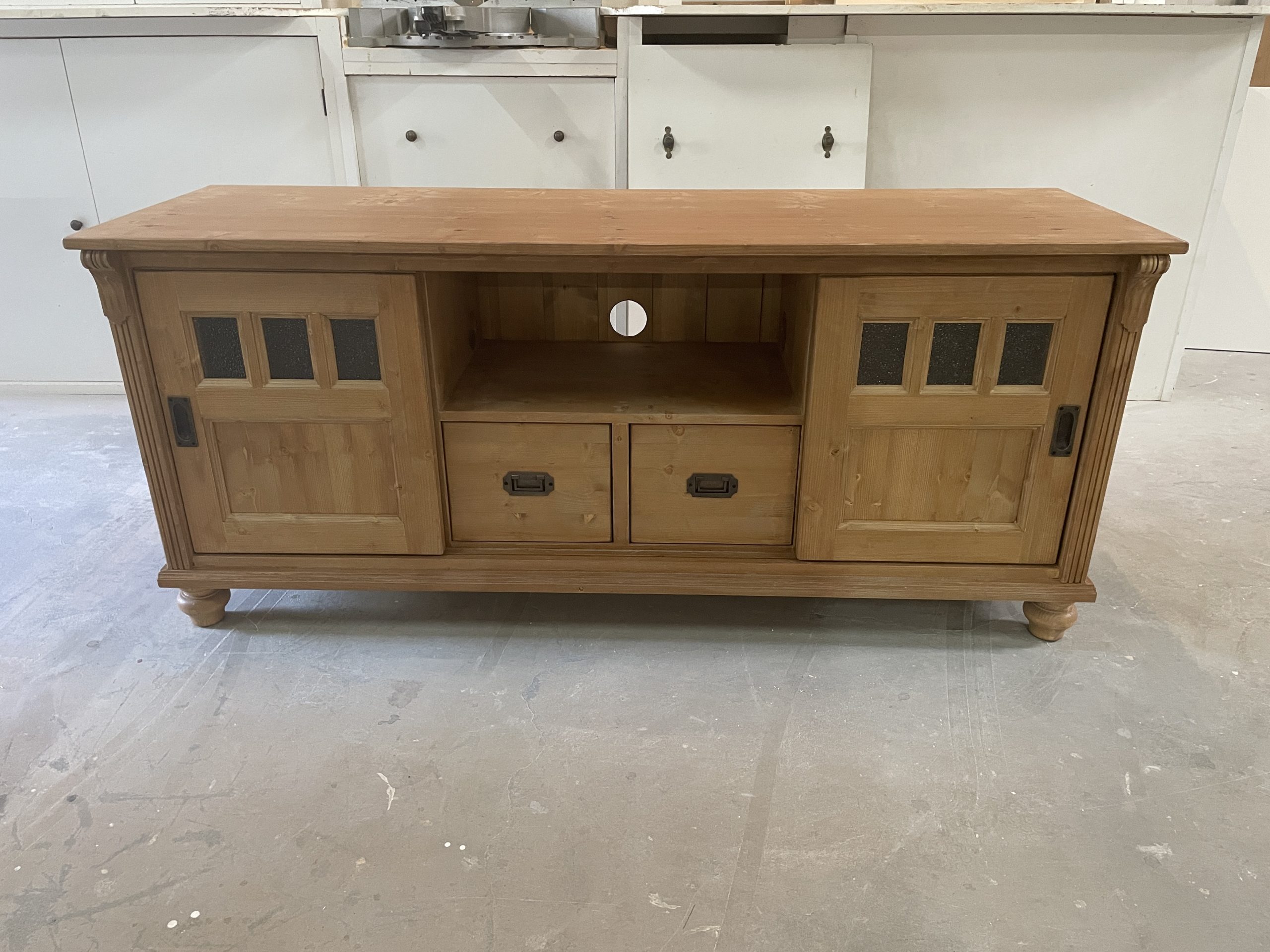 Dit tv-meubel wordt volledig op maat gemaakt en is voorzien van twee schuifdeuren, twee laden en een open vak. De kast staat op elegante kastpoten en is afgewerkt met rillen en een bolsnek op de stijlen, gecombineerd met een strak bovenblad.
