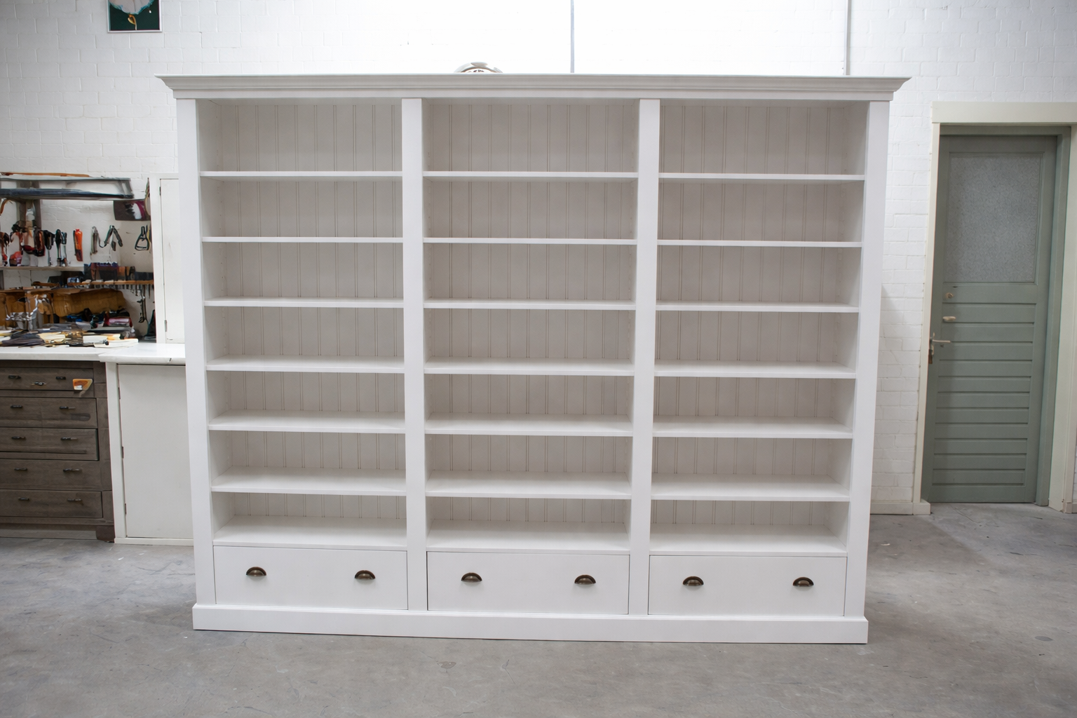 White wash boekenkast model Assen heeft de naam te danken aan het feit dat het de woonplaats is van de klant die de kast als eerste zo besteld heeft. De kast is opgebouwd uit drie losse elementen en  een plint- en koplijst die uit één geheel bestaan. Door deze bouwwijze is de kast bijna altijd makkelijk plaatsbaar in de woning en blijft altijd te verhuizen. Als de kast eenmaal gemonteerd is, valt niet te zien dat deze uit losse elementen bestaat. Deze white wash boekenkast heeft laden onderin voorzien van oud messing komgrepen. Er zijn rillen op de zijstijlen geplaatst en de boekenkast heeft een geprofileerde koplijst br 50 h 60 mm bovenaan. Bij een white wash afwerking blijft de houtnerf licht zichtbaar; het is dus geen dekkende laag zoals bij verf. De legplanken zijn via traditionele houten keeplatten eenvoudig in hoogte verstelbaar.